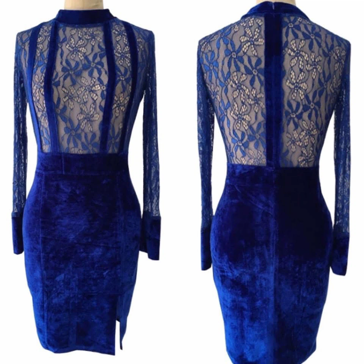 Beautiful blue dress featuring a velvet skirt and lace long sleeves! The dress has a high neck and a slit on the side. Perfect for a night out or special occasion