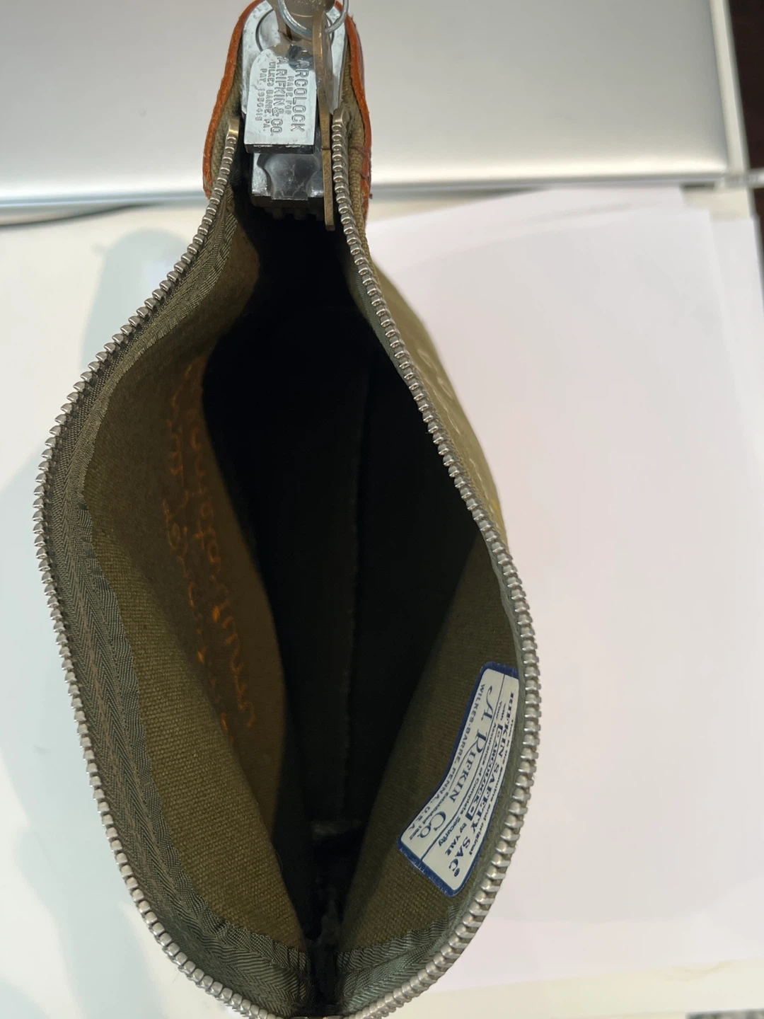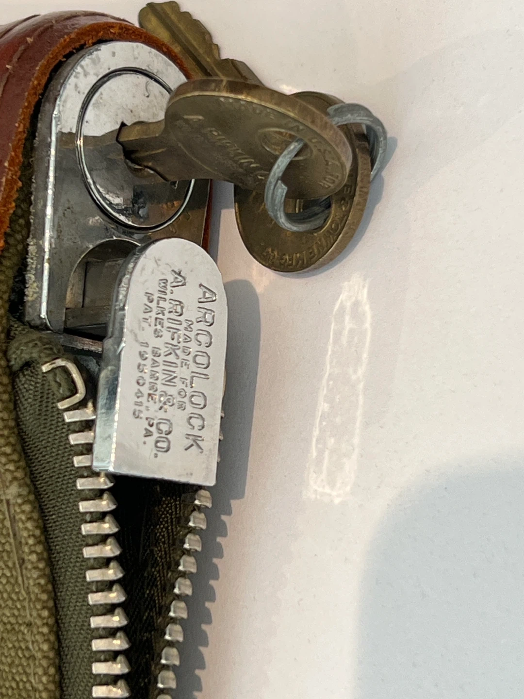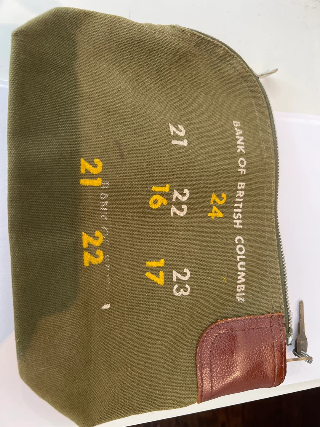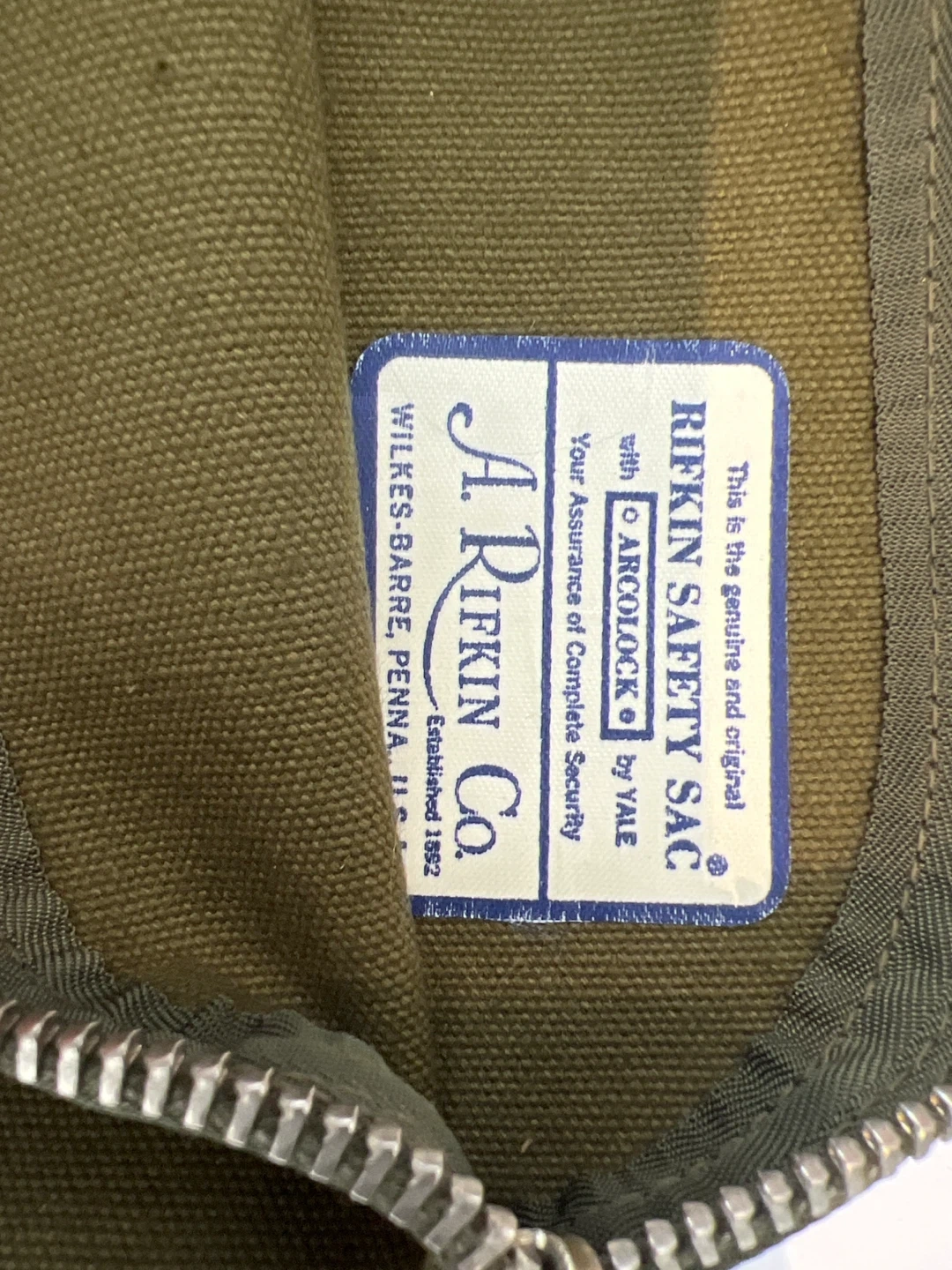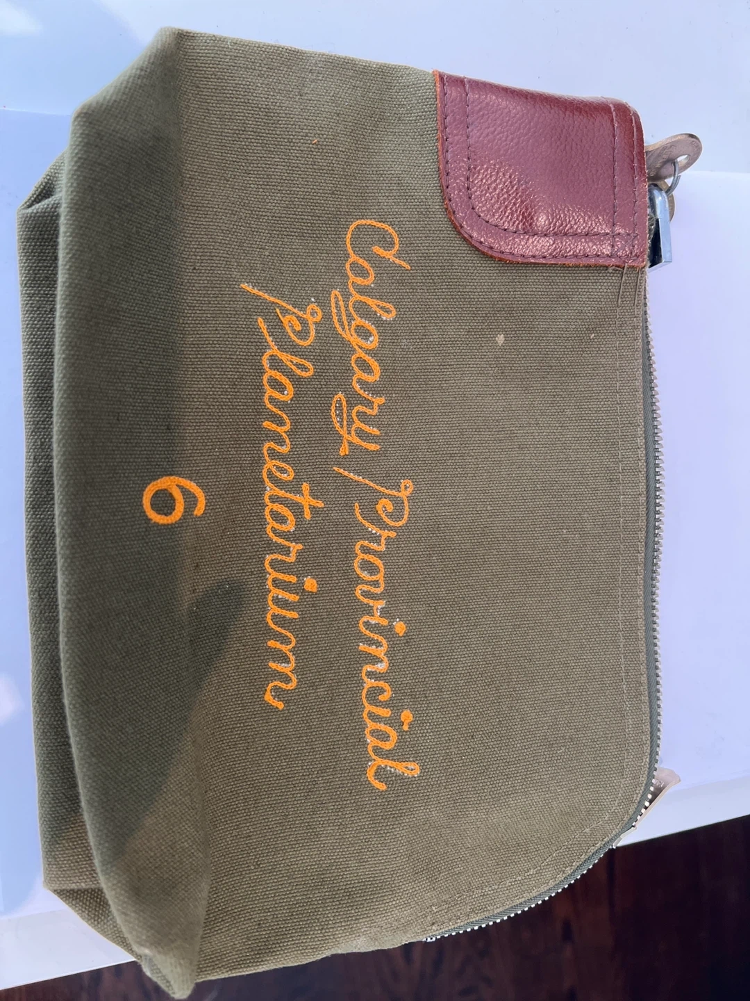 Selling a vintage Rifkin Safety Sac. It features "Calgary Provincial Planetarium" embroidered on the front. The bag is olive green with a leather accent piece and a zipper closure. It also comes with a lock and key!