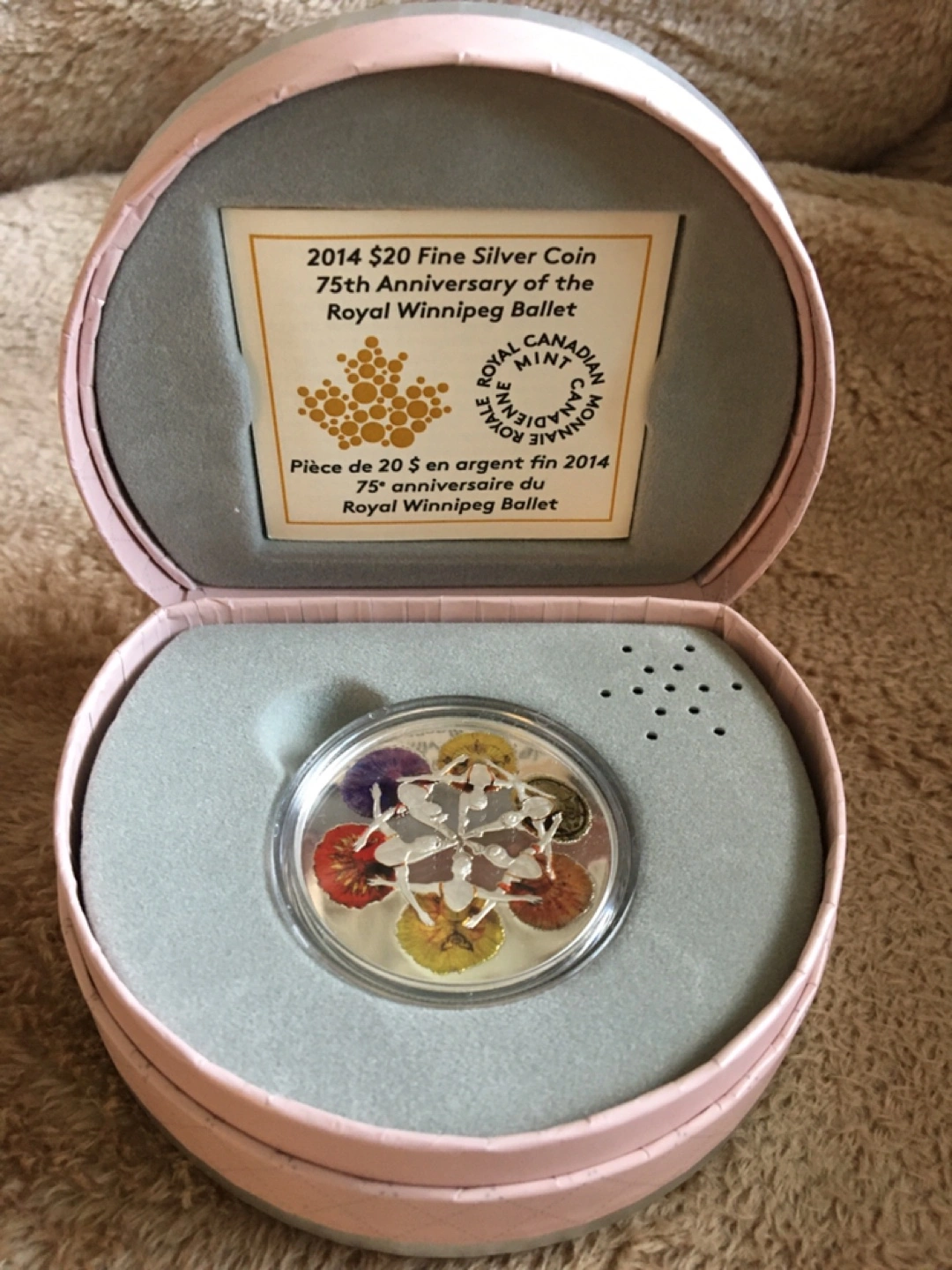 Selling a 2014 $20 Fine Silver Coin commemorating the 75th Anniversary of the Royal Winnipeg Ballet. It comes in its original box. A lovely piece for collectors!