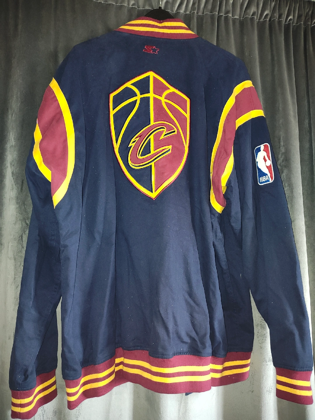 Selling a Starter brand Cleveland Cavaliers NBA jacket. It's a navy blue color with yellow and maroon accents. Features the Cavaliers logo on the front and back, and the NBA logo on the sleeve. Great for any Cavs fan!