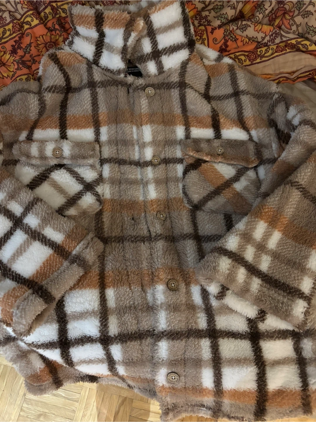 Cozy up in this super soft Garage Sportswear sherpa jacket! It features a brown and white plaid pattern and button-up closure. Perfect for layering on chilly days!š„