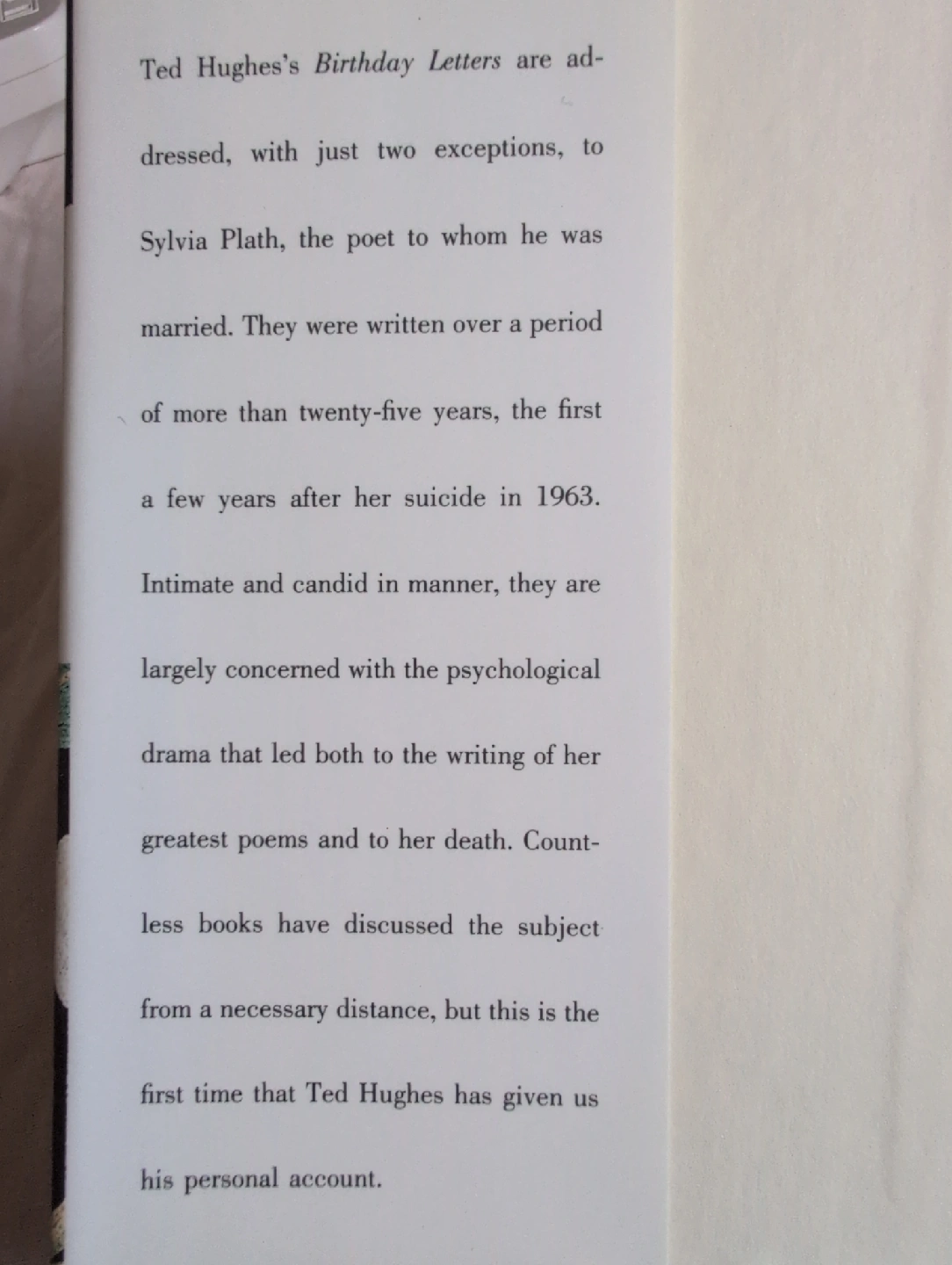 Selling a copy of "Birthday Letters" by Ted Hughes. This book contains poems addressed to Sylvia Plath, written over a period of more than twenty-five years. It offers an intimate and candid look into their relationship and the psychological drama that influenced their work