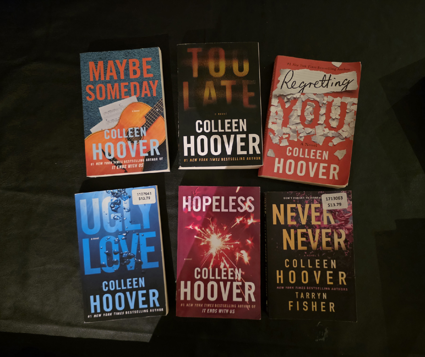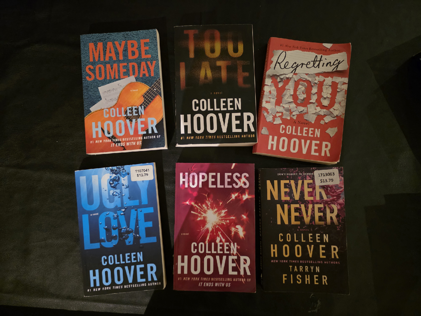 Selling a collection of novels by Colleen Hoover and Tarryn Fisher. Titles include Too Late, Never Never, Maybe Someday, Regretting You, Ugly Love, and Hopeless