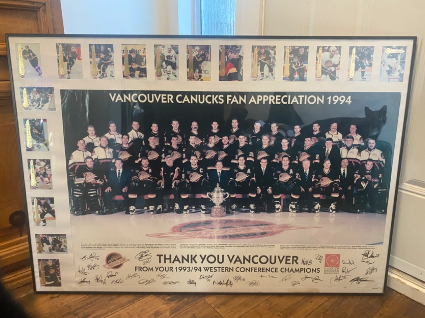Selling a framed poster commemorating the Vancouver Canucks' 1993/94 Western Conference Championship and fan appreciation. It features the team photo, signatures, and individual player cards. A great piece for any Canucks fan!