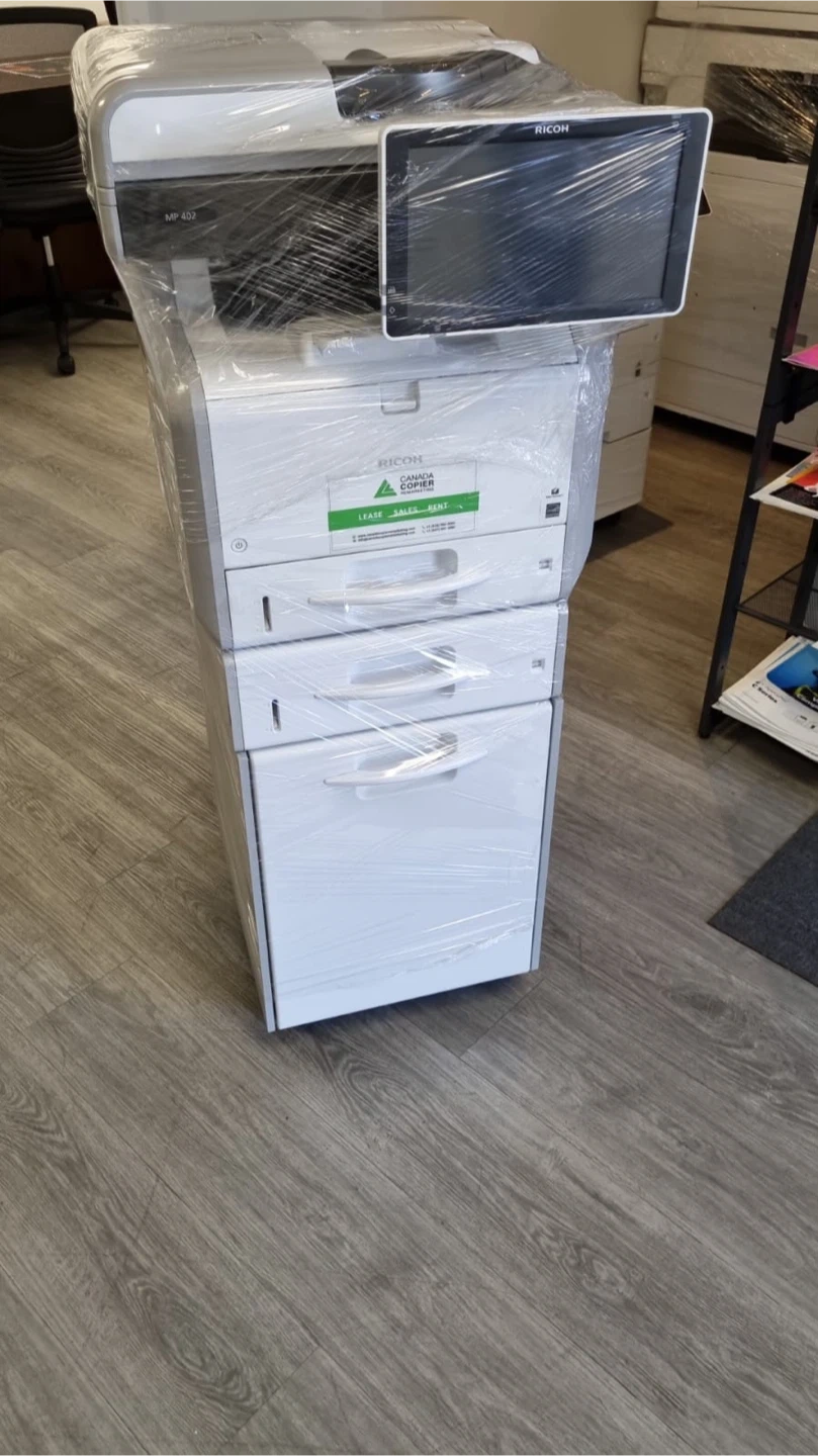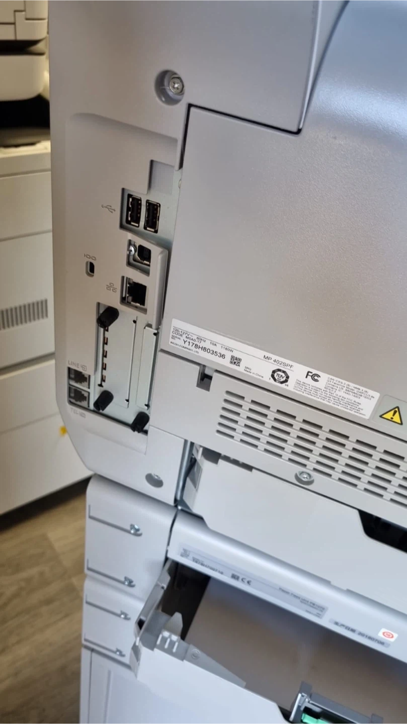 Selling a Ricoh MP 402SPF multifunction printer. It's in great condition and ready to go! This model is known for its reliability and efficiency in office environments. Perfect for printing, scanning, and copying needs. It comes with multiple drawers for paper storage and a user-friendly touchscreen interface.