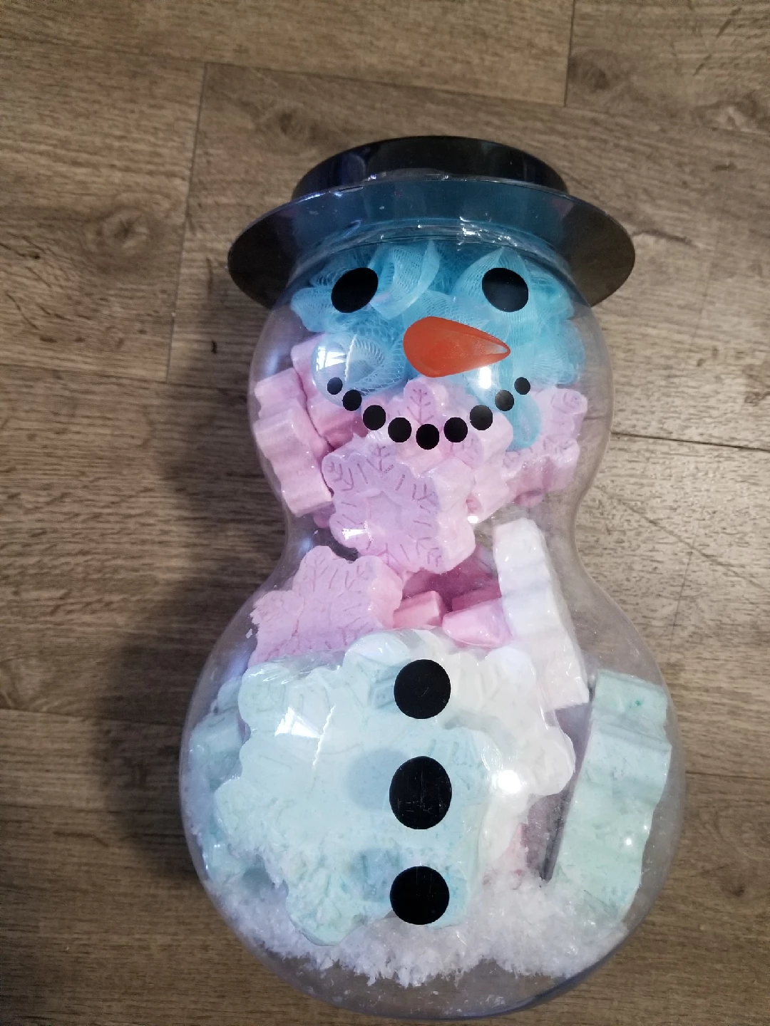 I'm selling a jar of bath bombs shaped like a snowman! The bath soap are pastel coloured and snowflake shaped. Perfect for a relaxing bath on a cold winter day