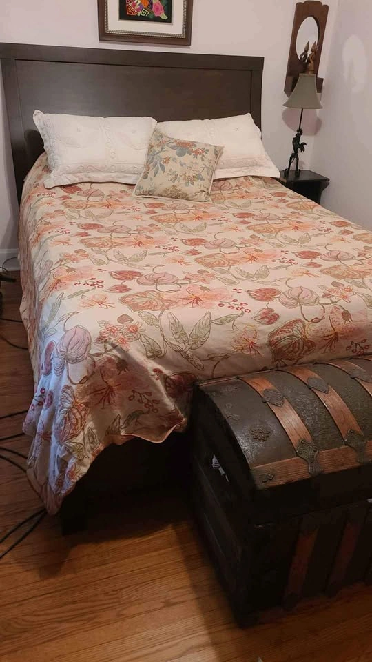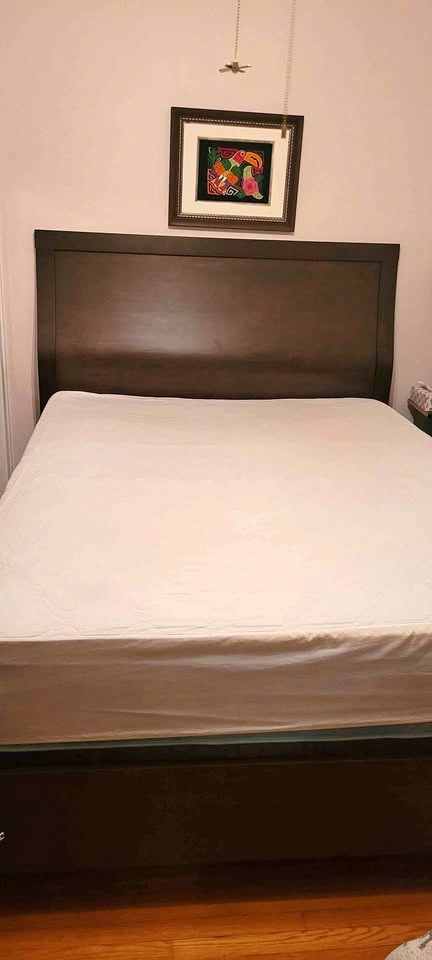 Well made, sturdy Queen bed. Made in Canada. Bed is in good condition. Smoke free home. We have a small hypoallergenic dog that does not go on the bed. Only selling it because we want a smaller bed since the room is quite small, nothing wrong with it, it's a great, sturdy bed. NO mattress included. ONLY bed frame. Doesn't need slats, only box spring (not included) Top/head part of the bed is 53" height x 63" wide. Length is 80". Pick up in Dundas L9H 4H8 postal code.