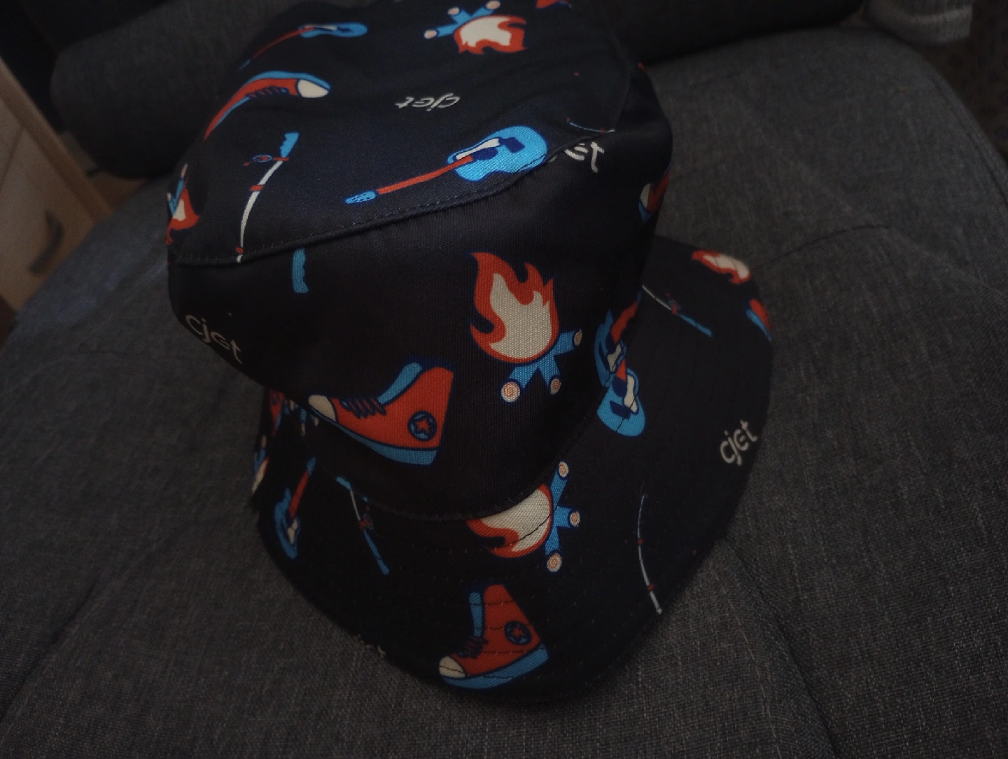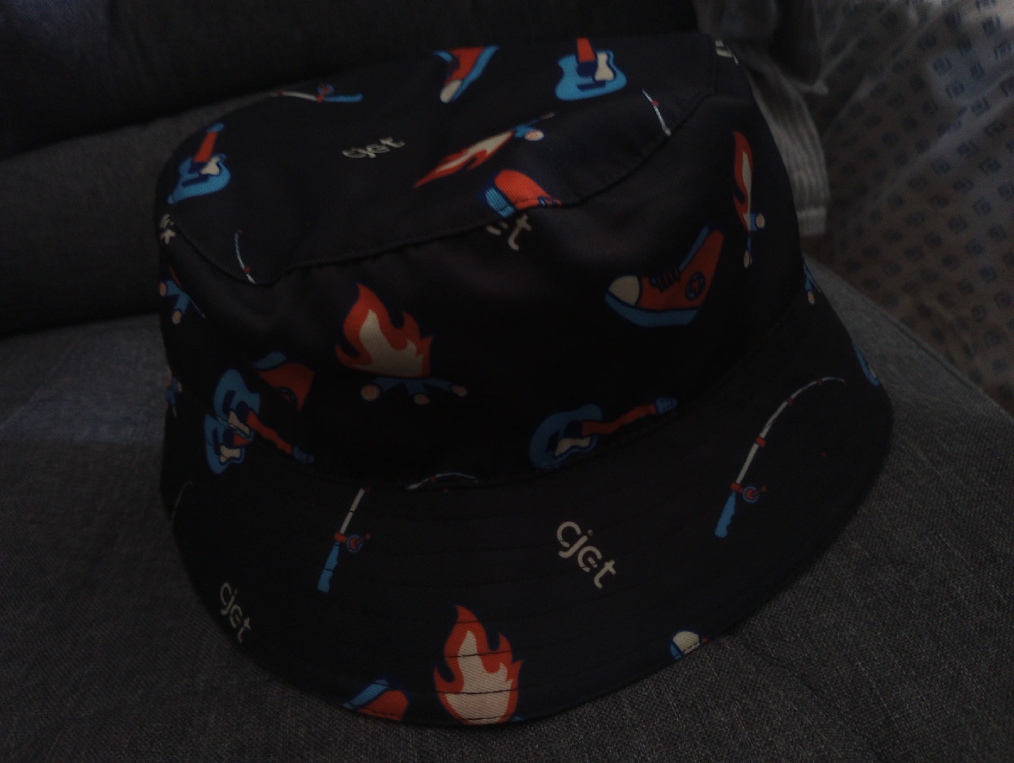 Looking to add a fun accessory to your wardrobe? This cjet bucket hat features a playful campfire design with fishing rods, guitars, and campfires. It's perfect for outdoor adventures or just adding a touch of whimsy to your everyday look! The hat is in great condition and ready for a new home