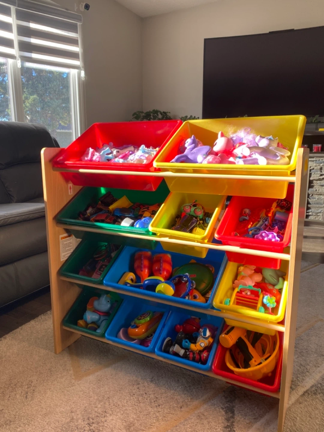 Looking to organize your little one's toys? This toy storage organizer is perfect! It features multiple colourful bins to keep everything neat and tidy. Great for playrooms or bedrooms. Toys are included.