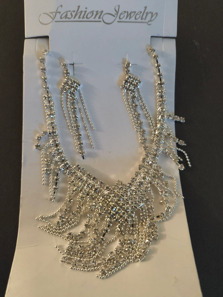 Selling a beautiful fashion jewelry set that includes a necklace and matching earrings. This set features a stunning design with sparkling details, perfect for adding a touch of elegance to any outfit