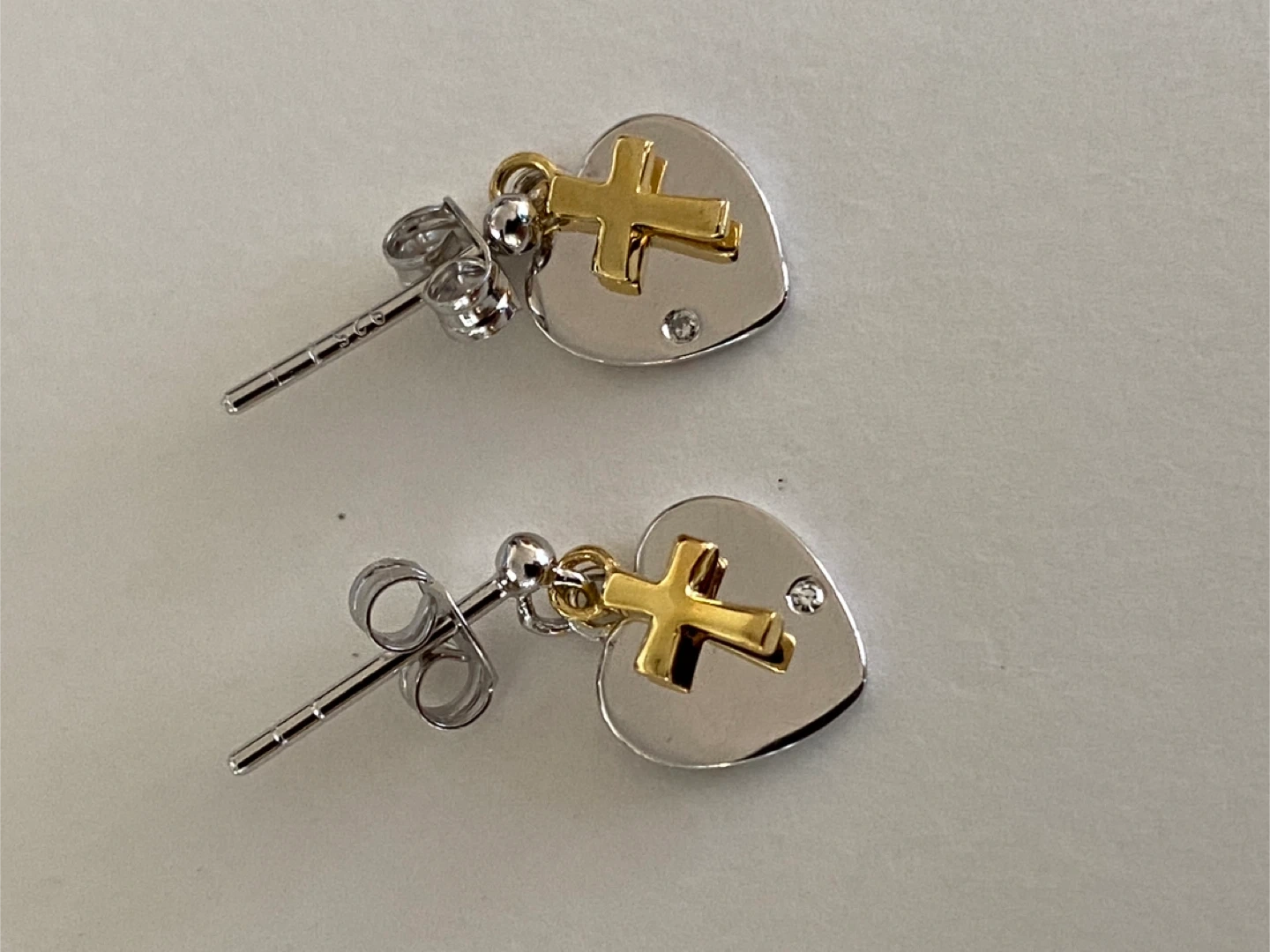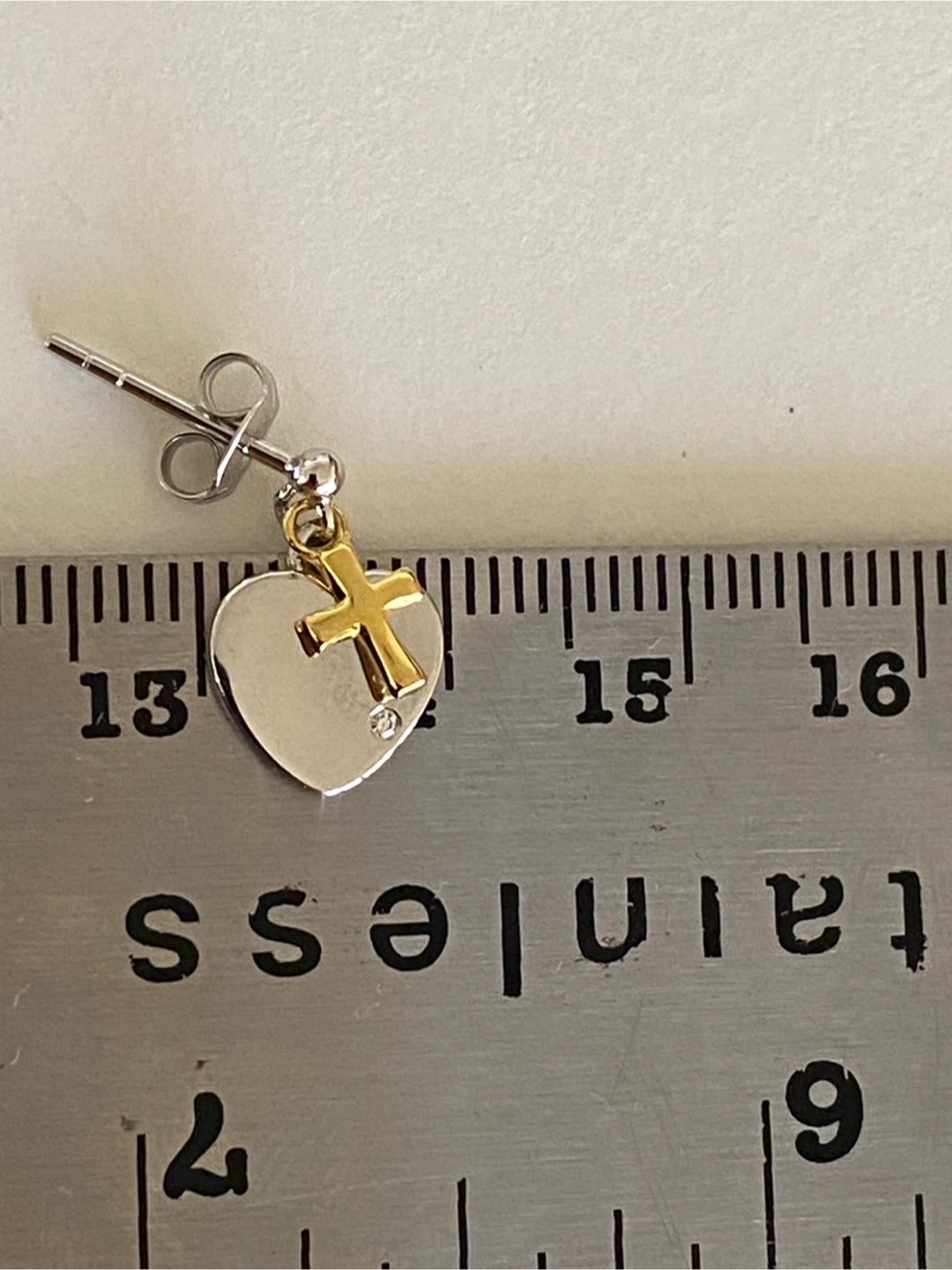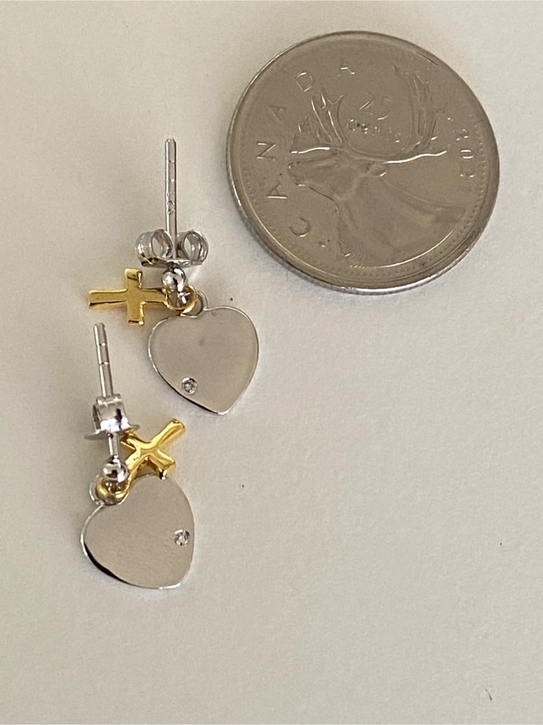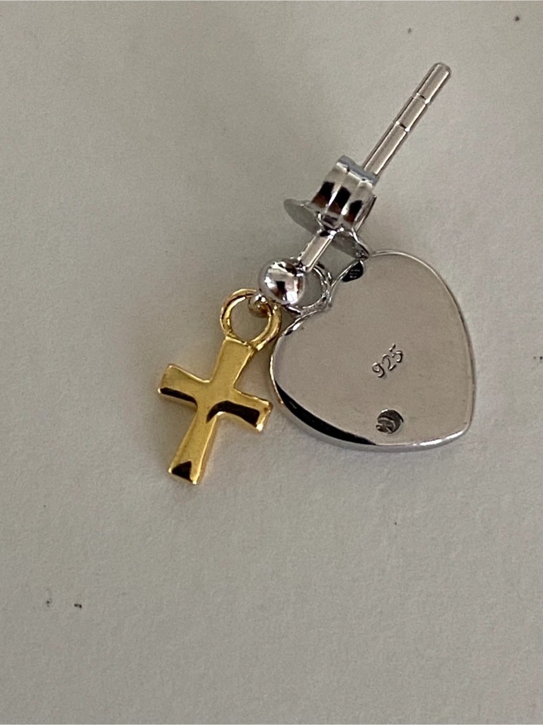 These are a new pair of cute heart-shaped earrings! They are made of 925 sterling silver and feature a gold-tone cross accent. Pick up at Yonge and Bloor