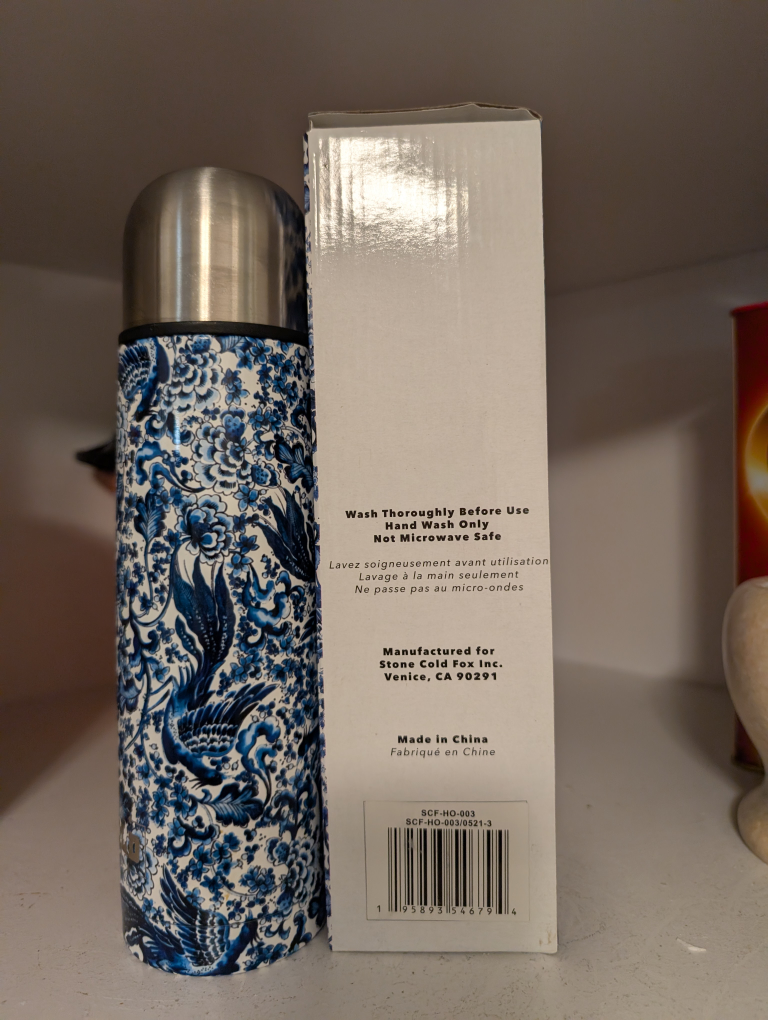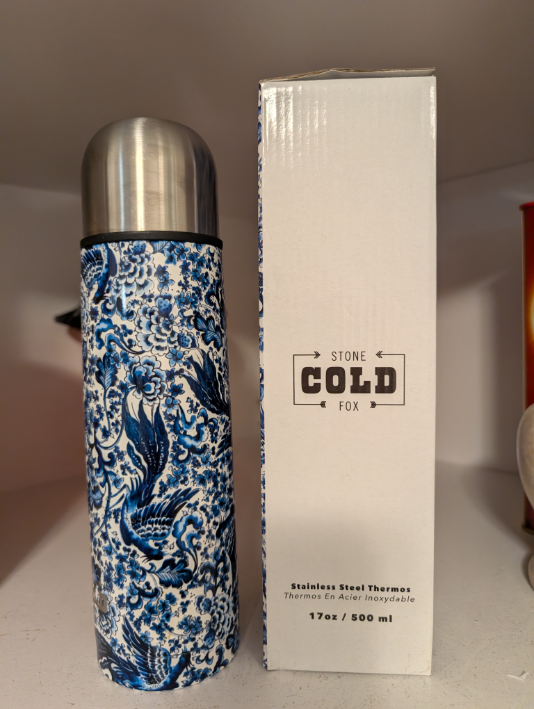 Keep your drinks hot or cold with this stylish Stone Cold Fox stainless steel thermos! It holds 17oz or 500ml and features a beautiful blue and white floral design. Hand wash only. Comes with the original box