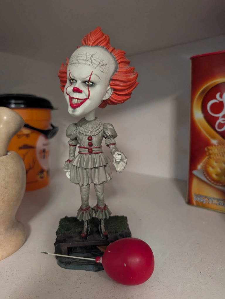 Selling an IT Pennywise bobblehead figure. It's in great condition and would be perfect for any horror fan or collector! The detail on the figure is really well done, from the cracked makeup to the creepy smile. It also comes with Pennywise's signature red balloon