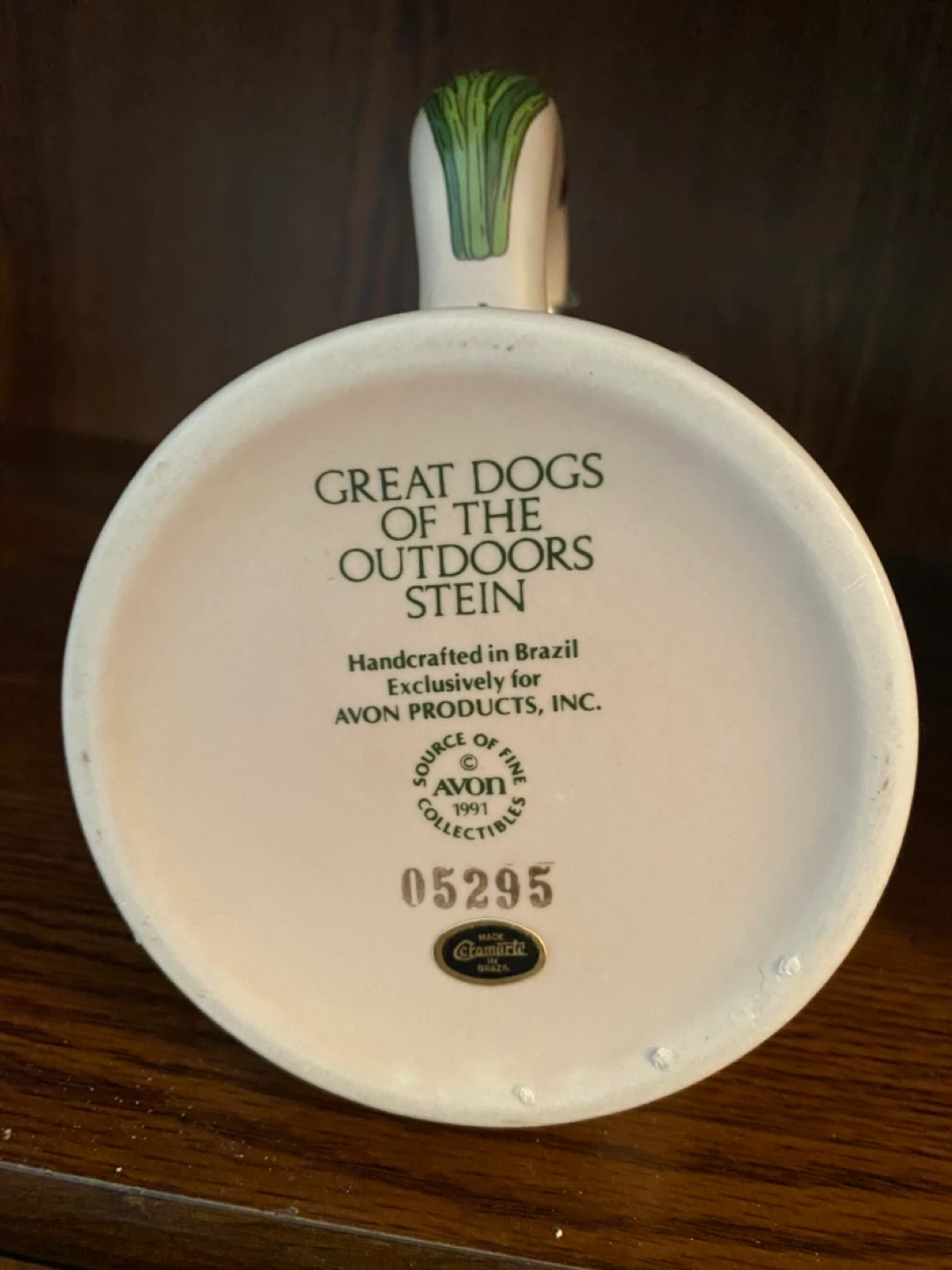 10This is a beautiful Avon collectible stein featuring "Great Dogs of the Outdoors"! It's handcrafted in Brazil exclusively for Avon Products, Inc. A lovely piece for any dog lover or collector