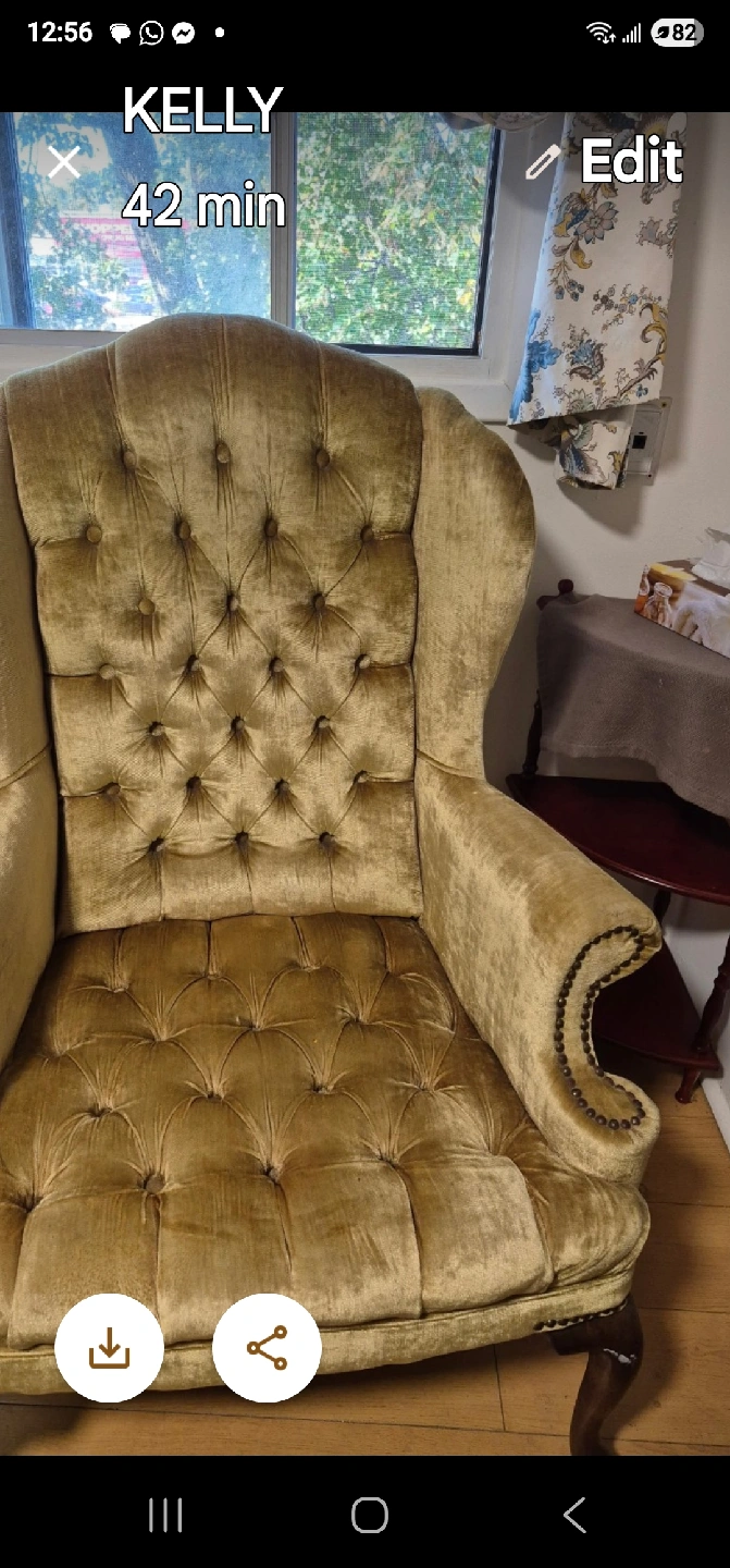 28Selling a beautiful vintage wingback armchair! It features a classic design with button-tufted detailing and nailhead trim. The upholstery is a soft, gold-toned velvet. It's a statement piece that would add a touch of elegance to any room
