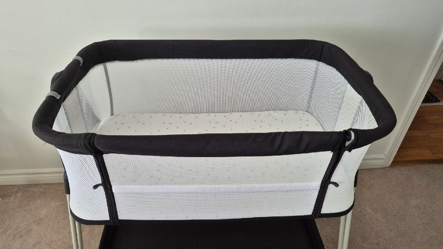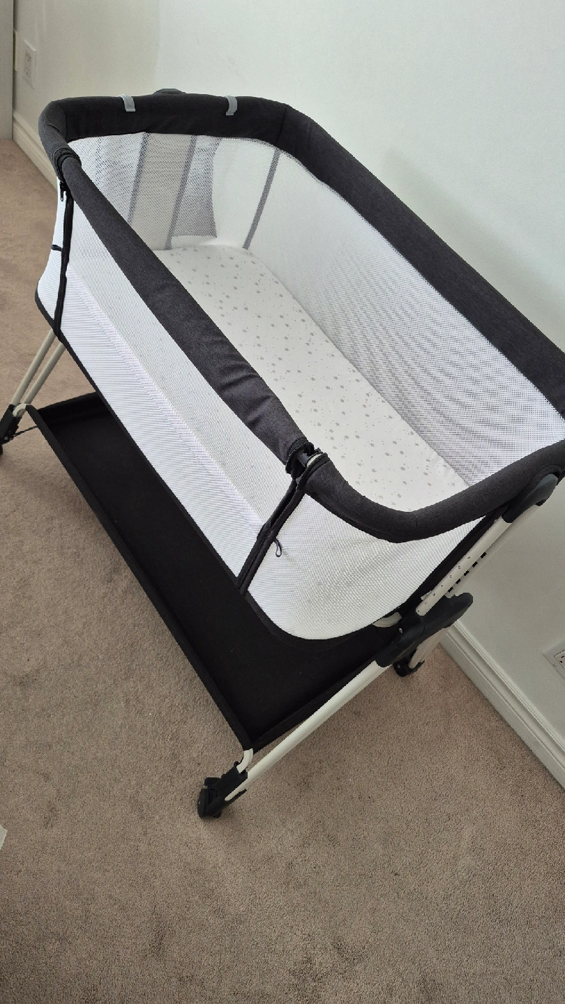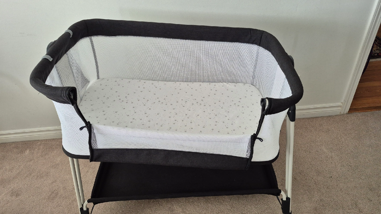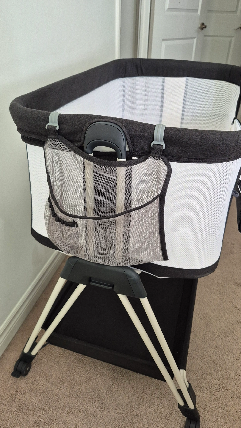 31Perfect for bedside sleeping or nap time! This adjustable-height baby bassinet is clean, sturdy, and gently used. -Features: • Mesh side panels for ventilation • Adjustable height (7 settings) • Large bottom storage basket • Padded mattress with washable cover • Neutral grey/white chevron pattern – unisex • Easy to move with wheels