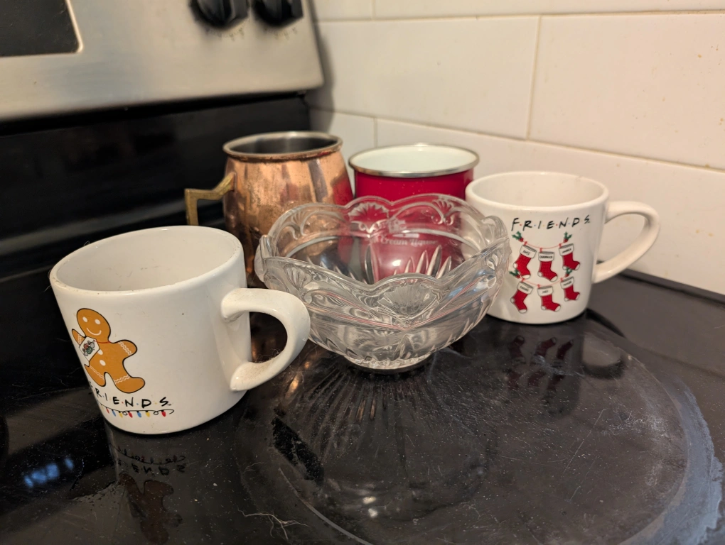 Selling a collection of mugs and a small glass bowl. There's a copper mug, a red and white mug, a 'Friends' themed mug with stockings, and a gingerbread man mug. Also included is a clear glass bowl with a decorative edge. All items are in used condition