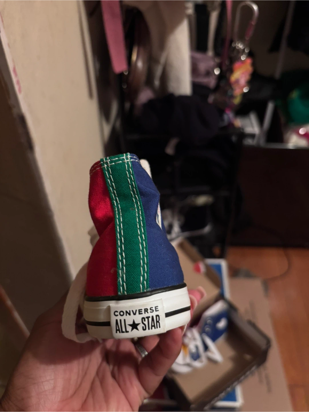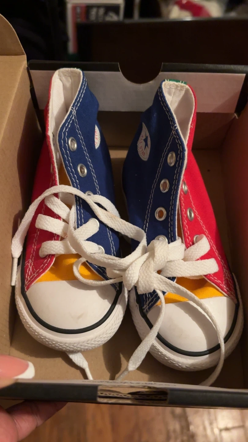 These Converse CTAS Hi infant sneakers are brand new in the box! They're a fun mix of enamel red, royal blue, and yellow. Size 7 infant.