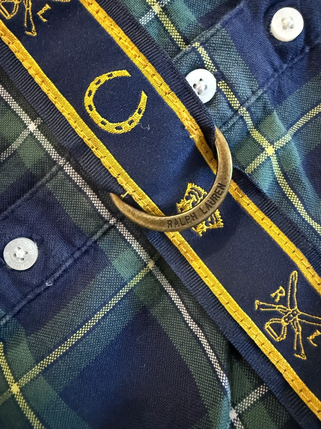 A cute Ralph Lauren plaid dress for a little one! It's size 2T and features a charming plaid pattern in blue and green. The dress also has a white collar and a decorative belt
