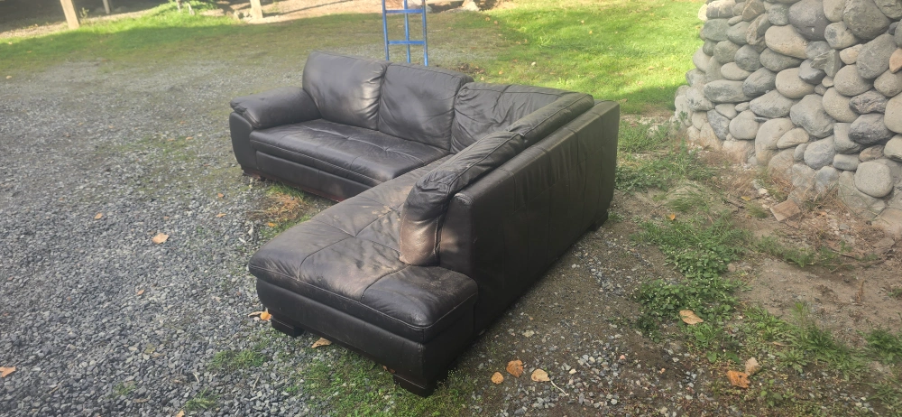 Selling a brown leather sectional sofa. Iin good shape. just dirty from sitting in storage, and it's going back in storage until someone buys it, I don't have my tape measure on me it's at work so I don't know the dimensions but it's medium sized