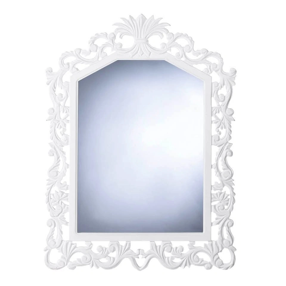 24This dreamy wood wall mirror features an intricately carved frame painted fresh white. The flourishes that climb and curl around the geometric arched mirror make this a stunning accent. Hang it in the entry or hall, above the bathroom sink, or in your bedroom. Reflective mirror: 11 1/2" x 15 3/4". Item weight: 2.6 lbs. 17+" x +" x 23+" high. MDF wood and mirror. Item is located in Port Robinson, if the item is listed its available.