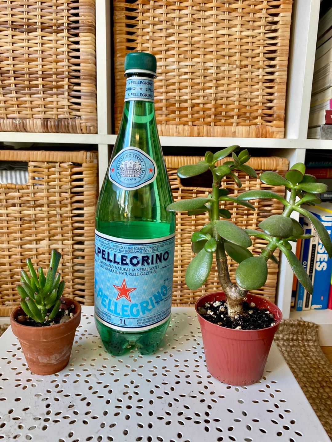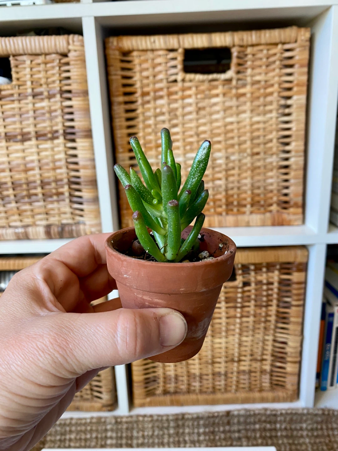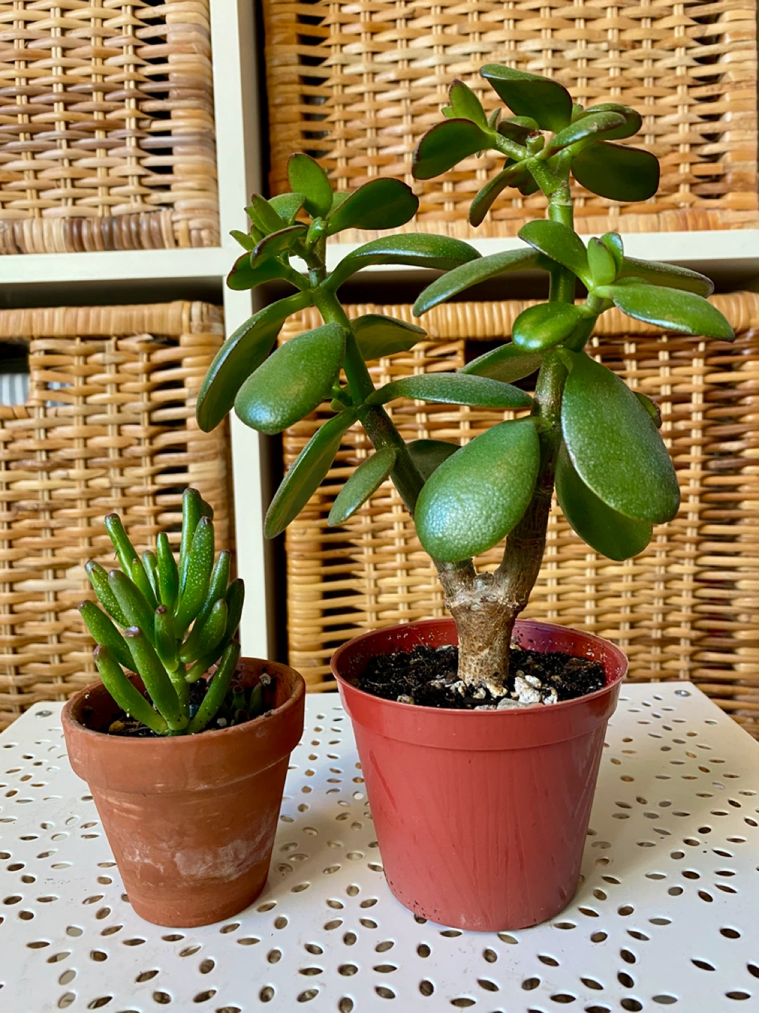 The larger one is Jade ( Crassula Ovata ) in a plastic pot and the smaller one is Gollum Jade in a ceramic pot.