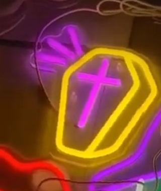 A bright neon light in the shape of a coffin with a cross. It's perfect for adding a unique touch to any room. It's in great condition and ready to light up your space!