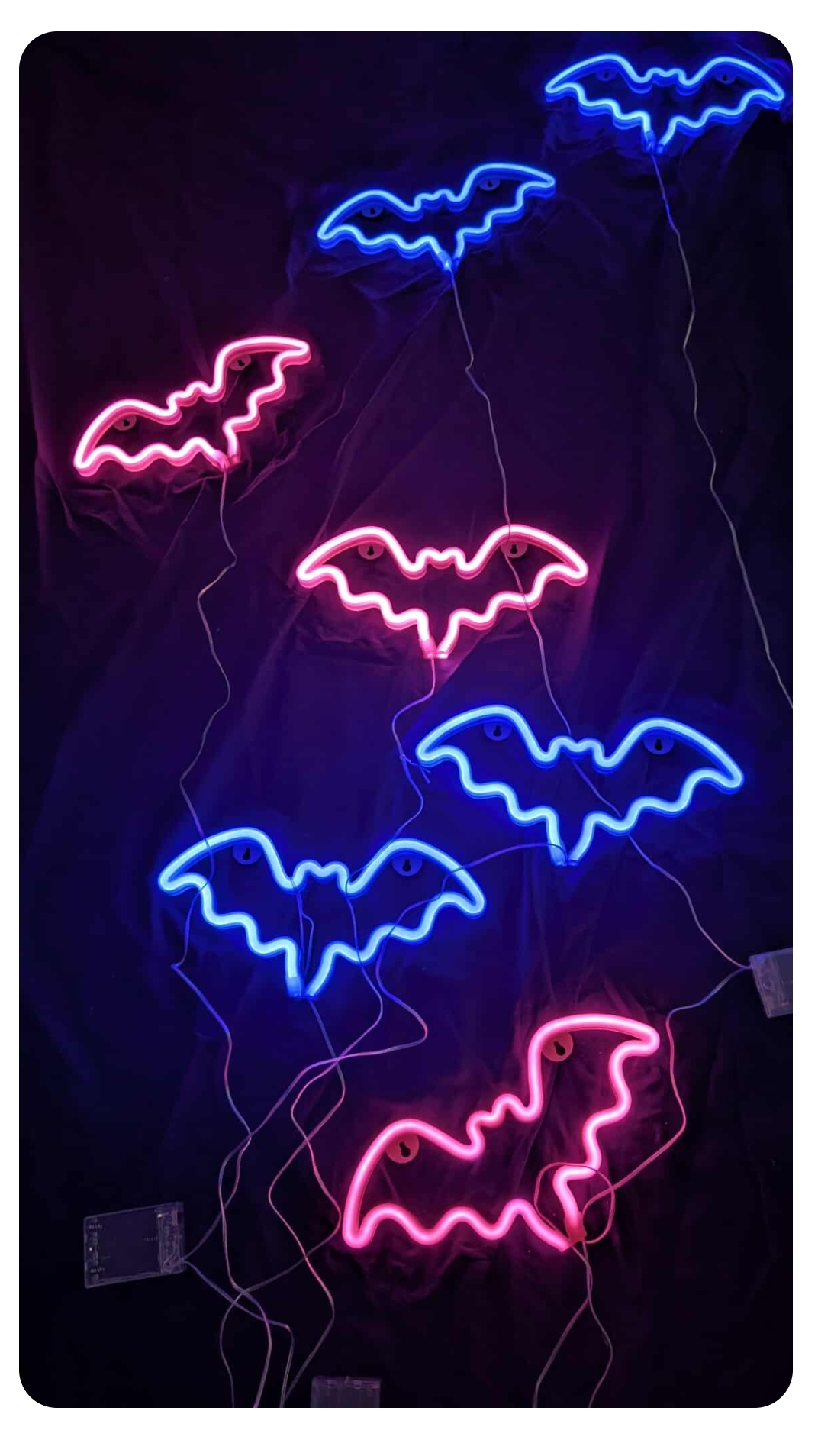 Add a spooky touch to your space with these fun bat-shaped neon lights! One is pink and the other is blue. They're perfect for Halloween or any time you want to add a bit of whimsy to your decor