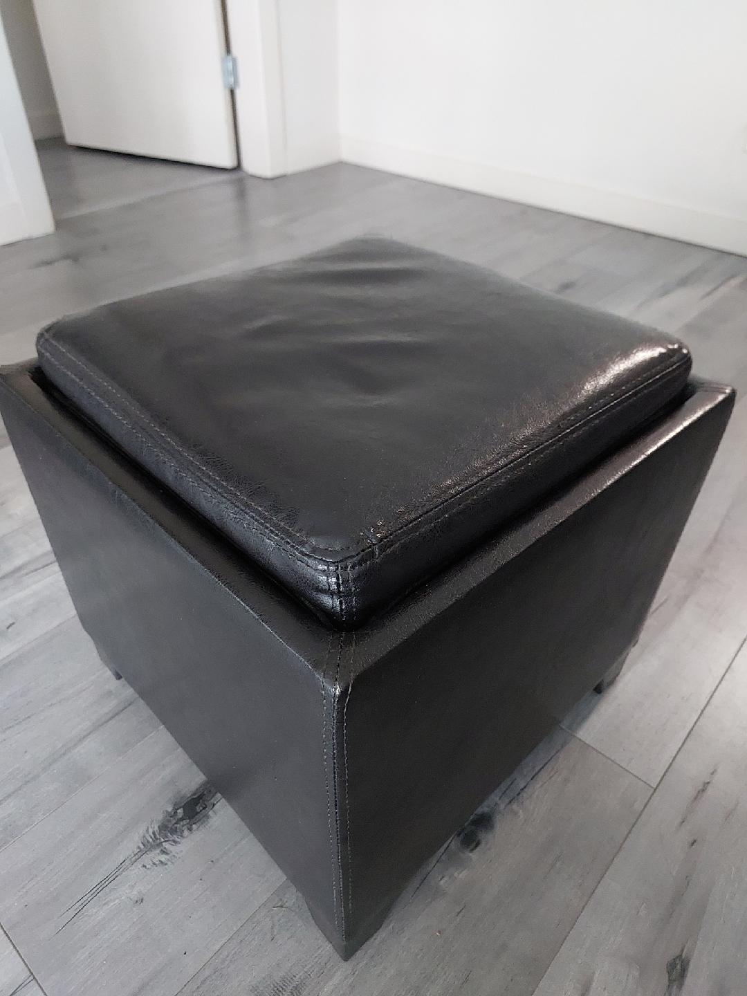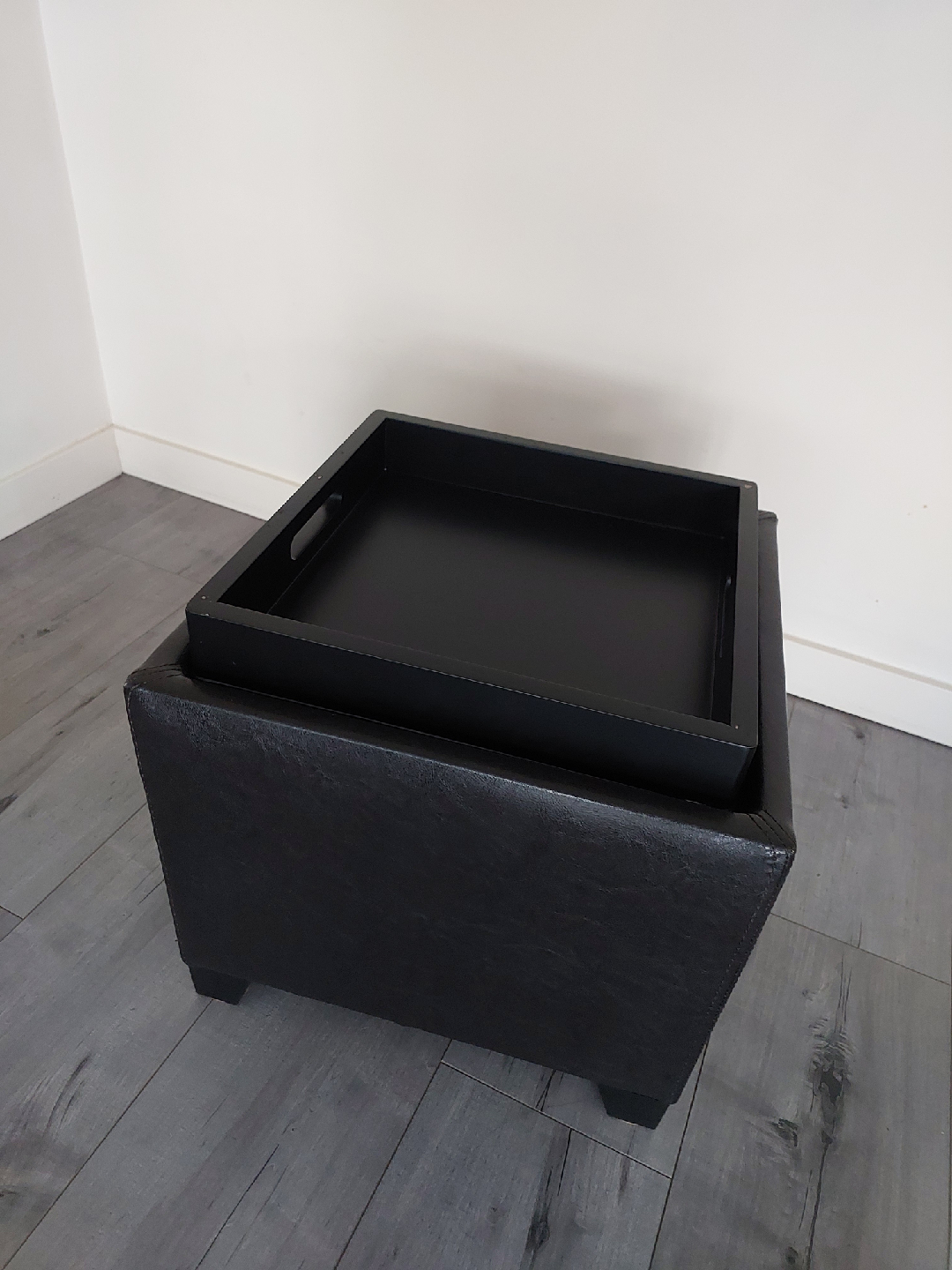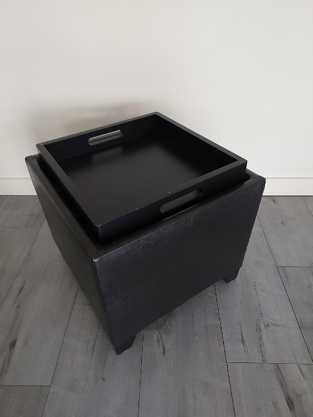 Looking to add some stylish storage to your place? This square storage ottoman is perfect! It comes with a removable tray, so you can easily use it as a coffee table or for serving snacks. It measures about 15" tall and is 16"x16" inches in width and depth . Please note there are some minor scuffs on the inside frame of the tray (photos included).