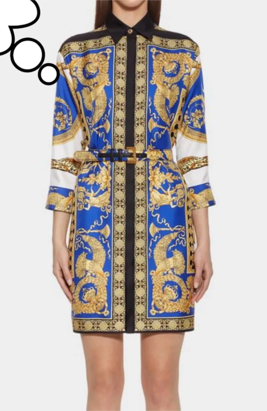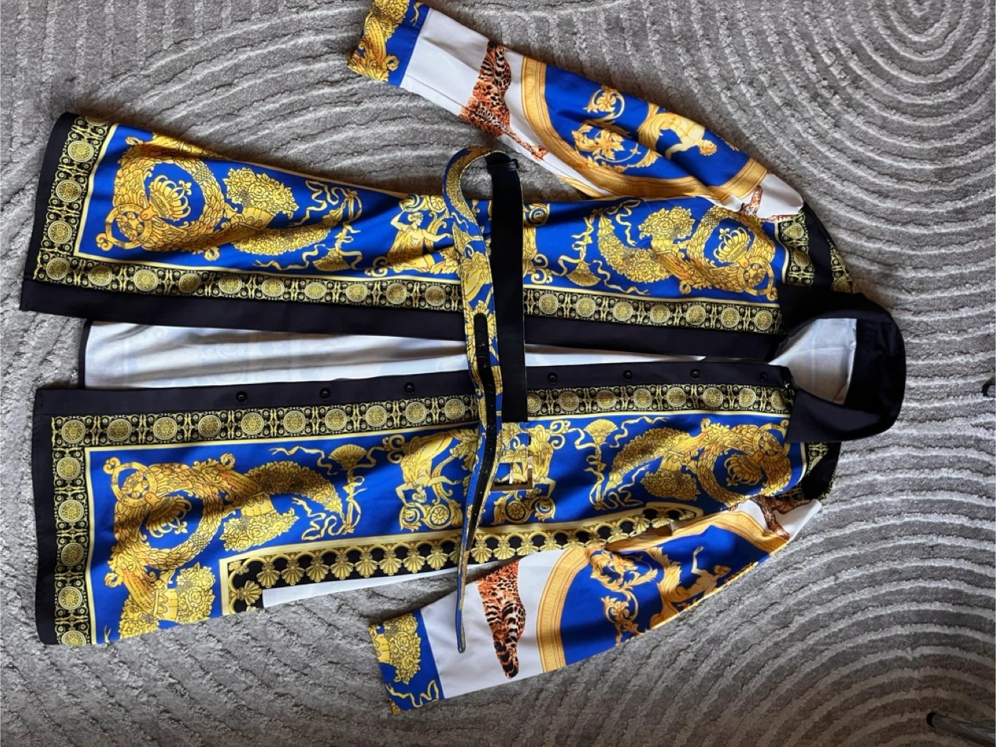 Selling a Versace style shirt with a striking blue and gold pattern. The shirt features a unique design with black accents. It's in great condition and ready for a new home!