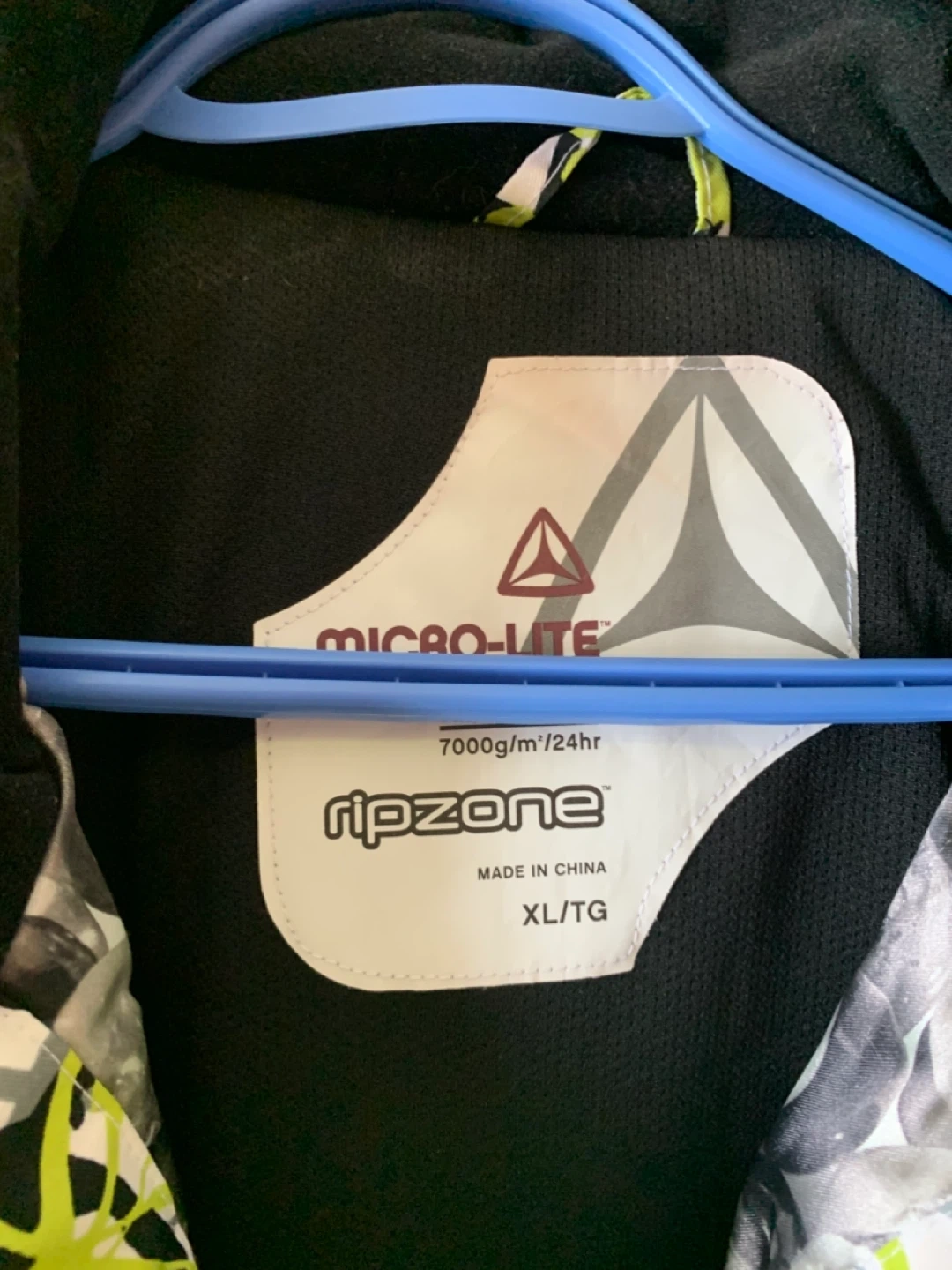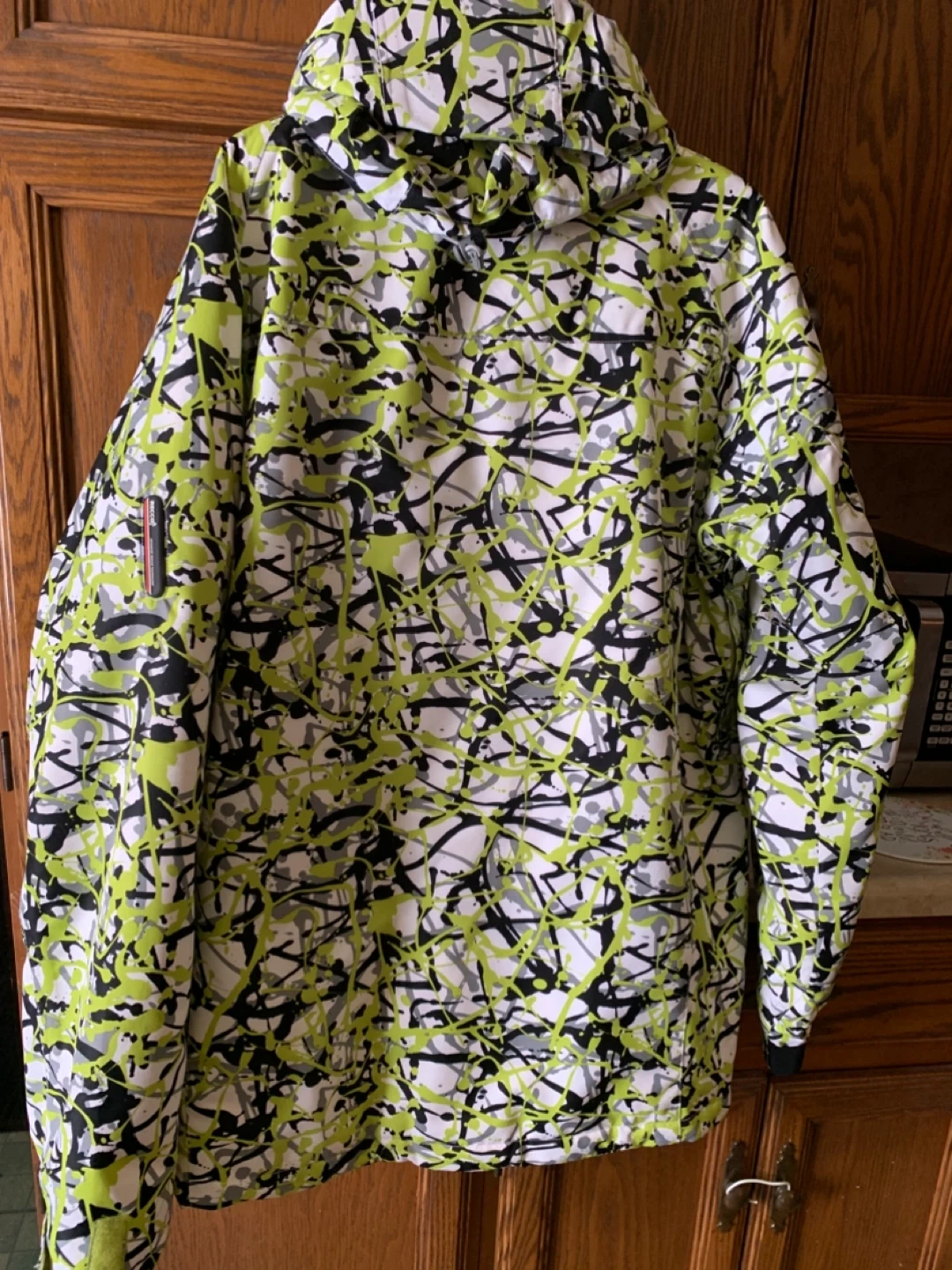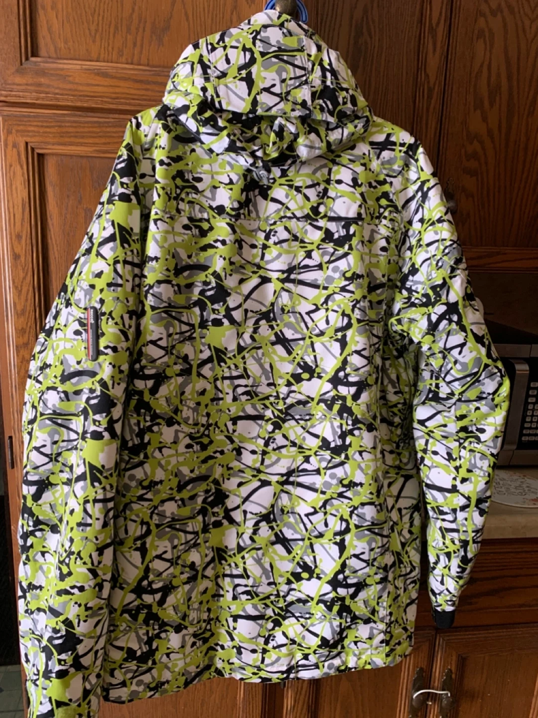 This Ripzone ski jacket comes in size XL/TG. It's made with MICRO-LITE fabric and features a bold black, white, and lime green abstract splatter design. It's great for hitting the slopes!