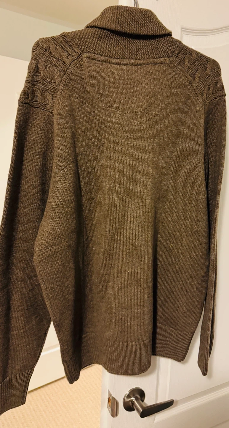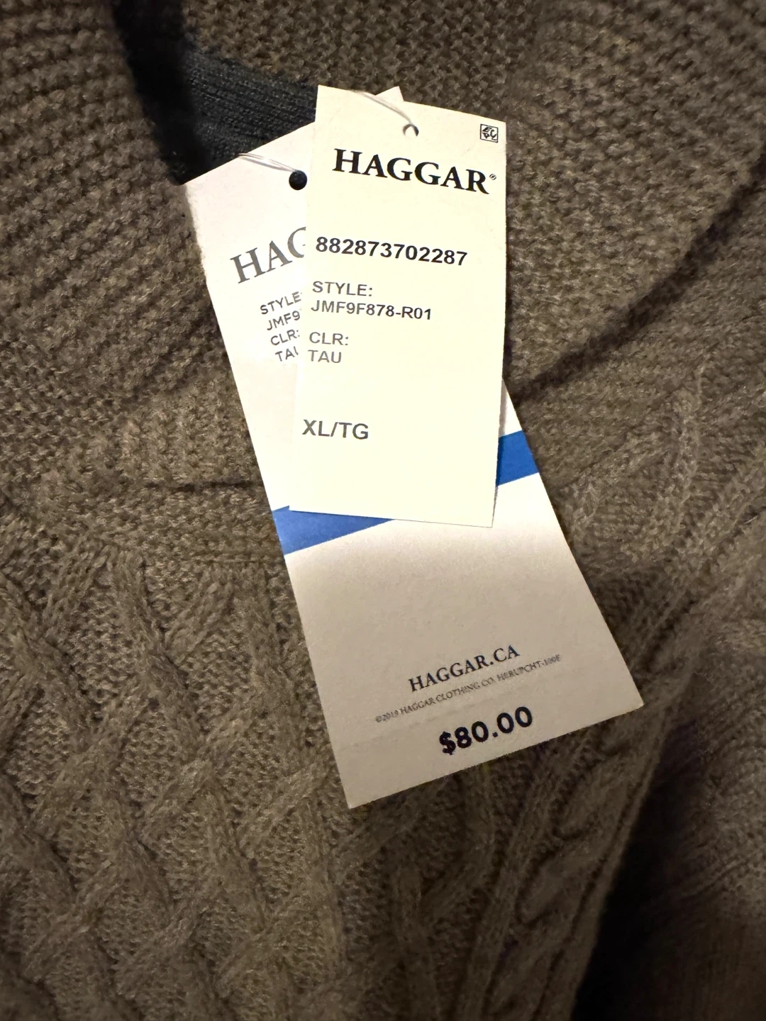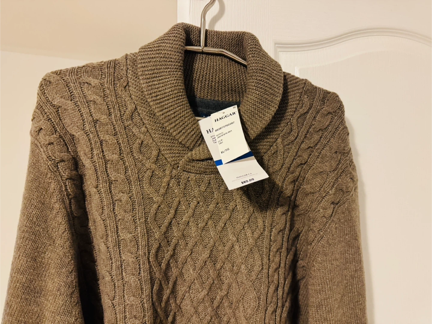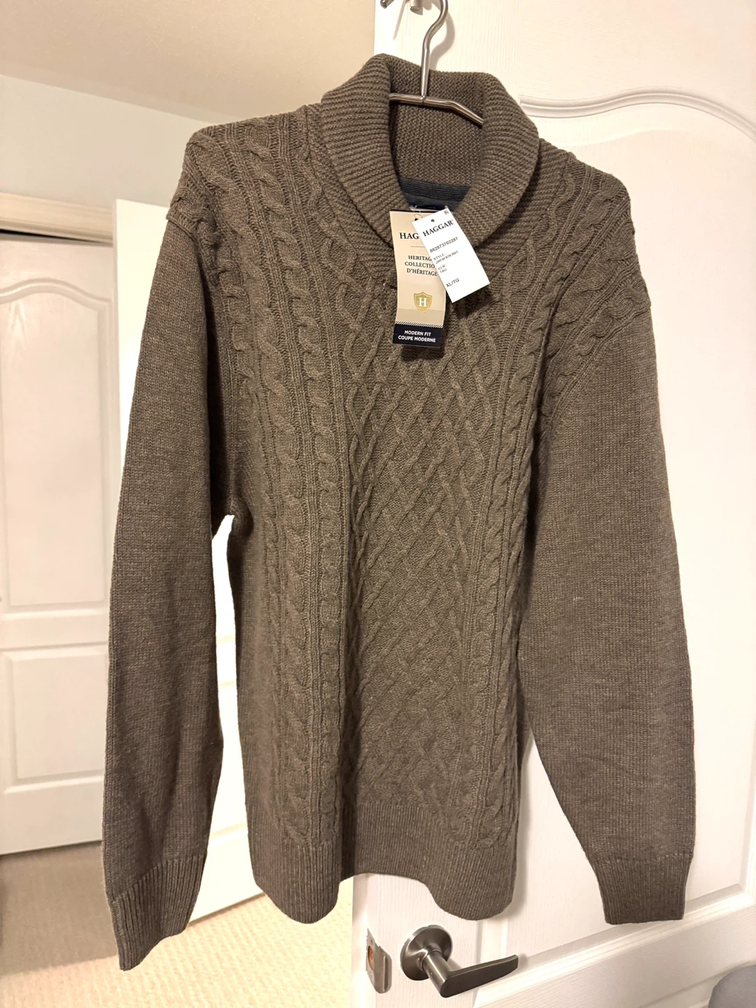 This is a Haggar men's shawl collar sweater. It's a taupe colour with a cable knit design. The size is XL/TG and it's part of their Heritage Collection. It's a modern fit sweater.