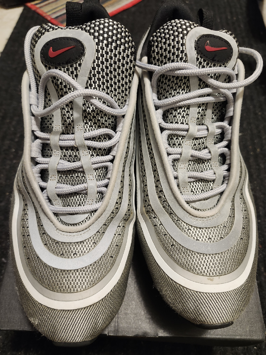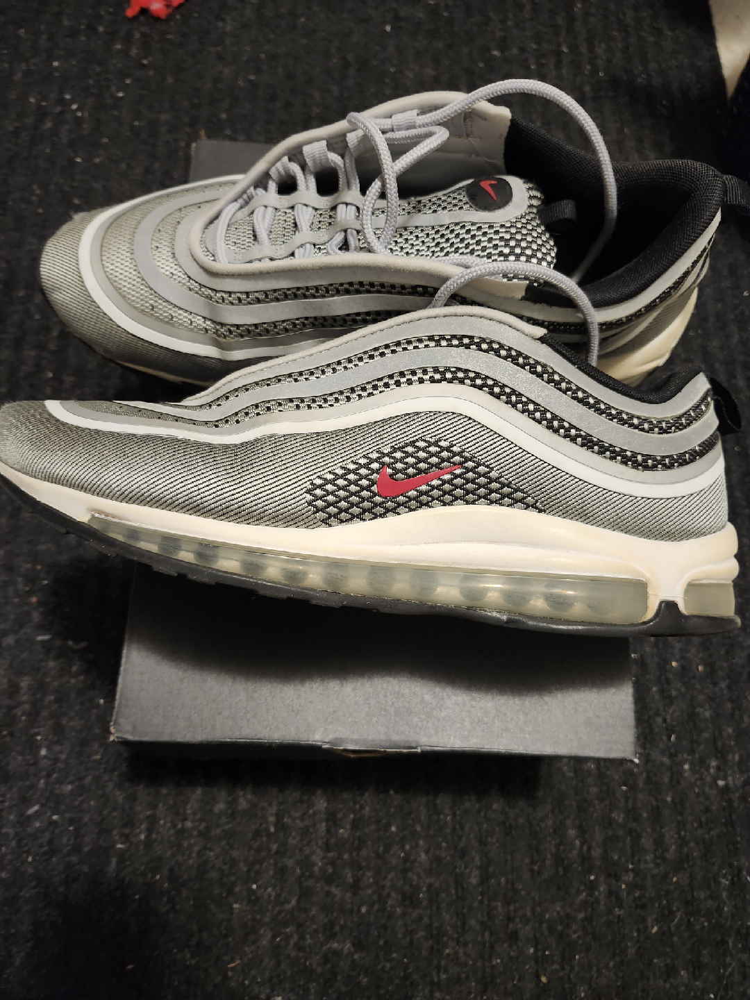 Selling a pair of Nike Air Max 97 sneakers in grey. These are in good condition and come with the original box. They feature the classic Air Max cushioning for comfort and a stylish design that's sure to turn heads. Perfect for everyday wear or hitting the gym!