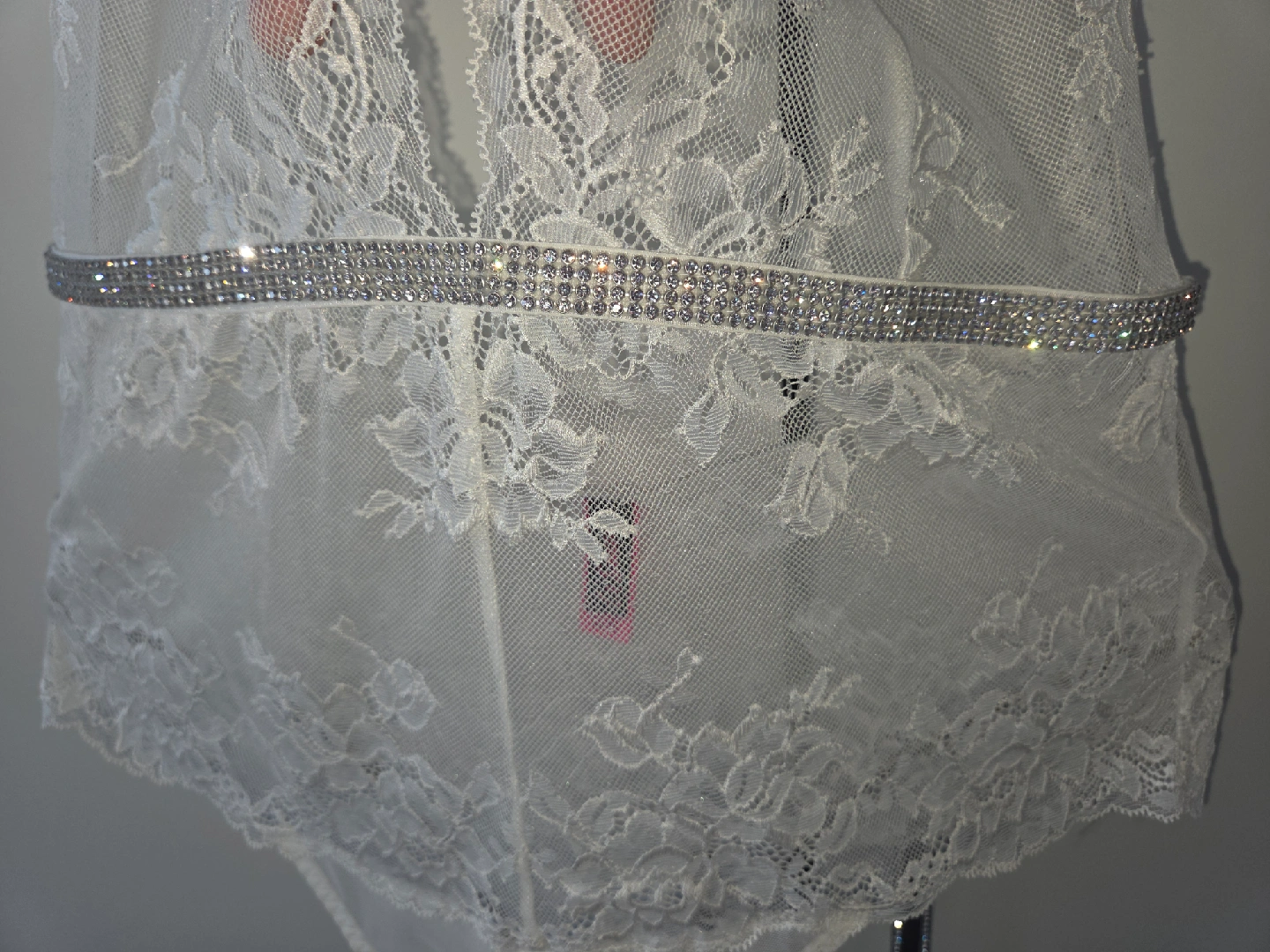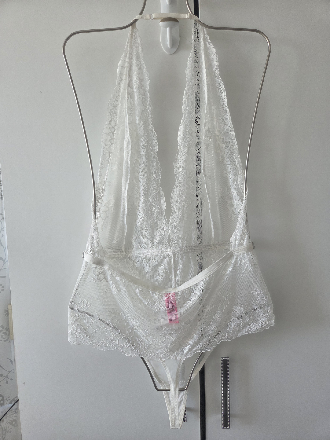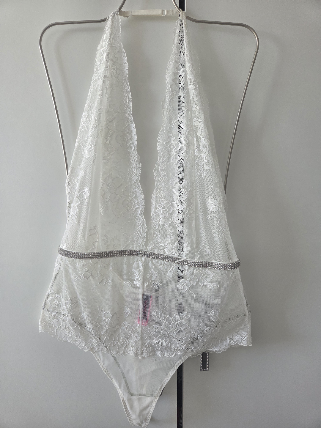 Selling a beautiful white lace halter bodysuit. It's in great condition and features delicate lace detailing. Perfect for a special occasion or adding a touch of elegance to your wardrobe