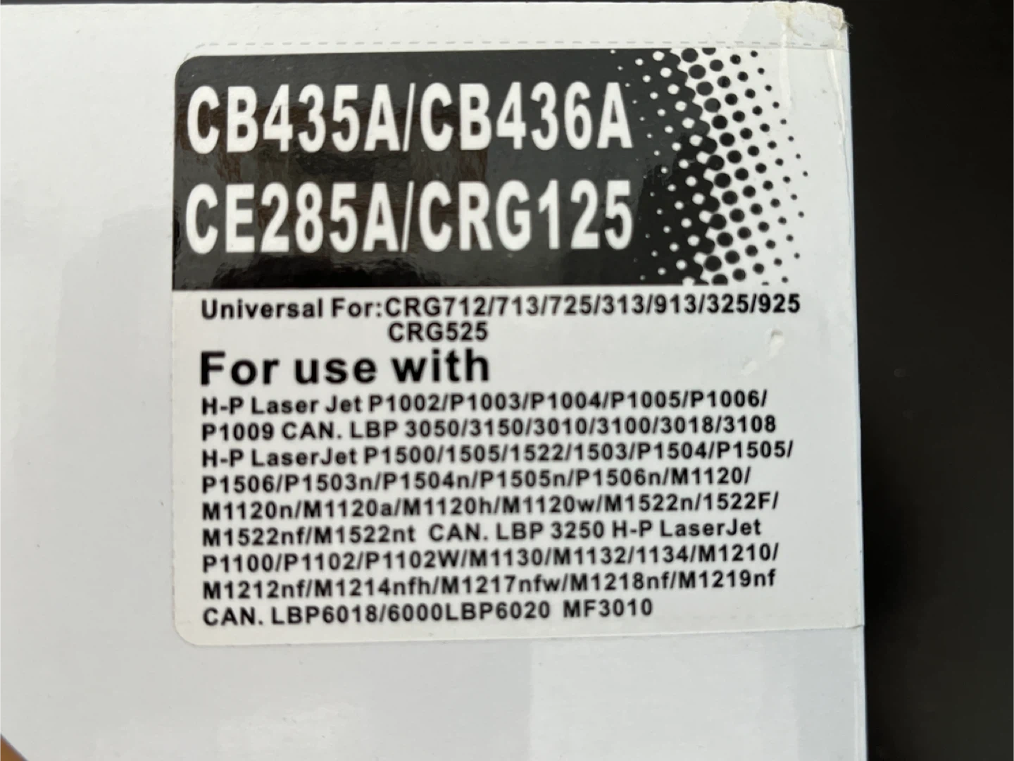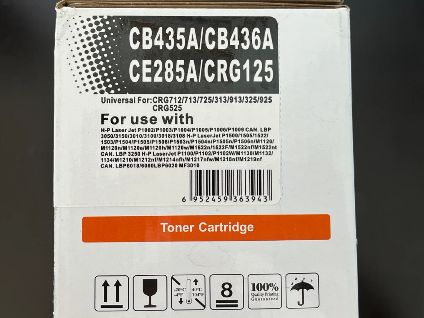 New HP CB435A/CB436A CE285A/CRG125 toner cartridge. This universal cartridge is compatible with a range of HP LaserJet and LBP printers, including various models in the P1000, P1500, M1120, and LBP3050 series. Ensure top-quality prints with this reliable toner cartridge.