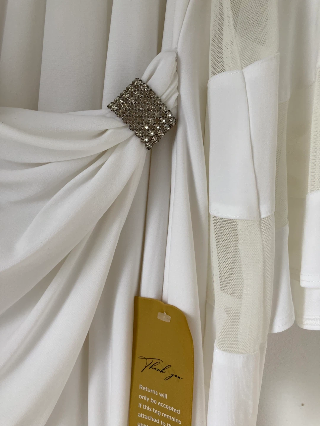 The front of the dress is faux wrapped with a jewelled closure on the right.