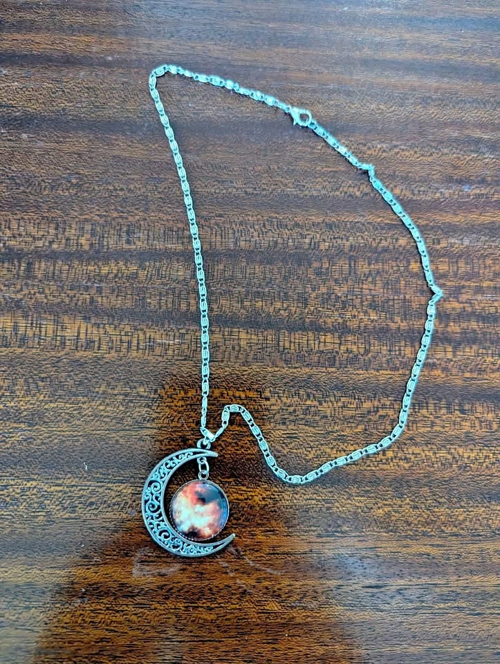 119Beautiful silver-tone necklace featuring a detailed crescent moon pendant with a colorful, galaxy-like design. The chain has a lobster clasp closure. Perfect for adding a touch of celestial style to any outfit. New and ready to be worn!