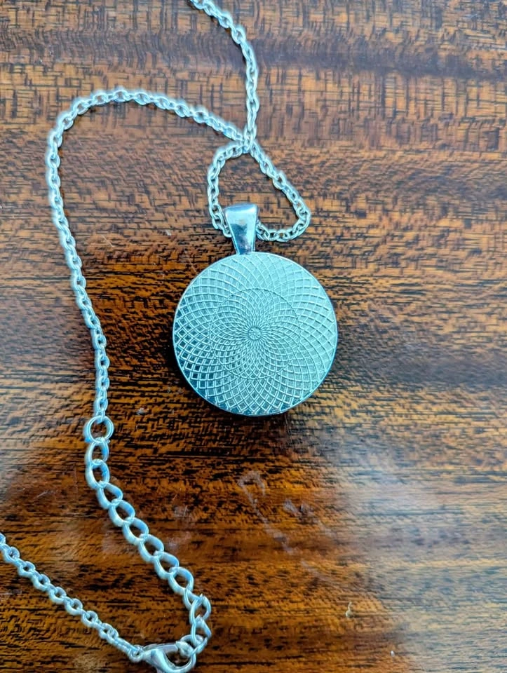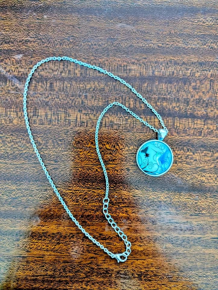 119This stunning necklace features a circular pendant with a vibrant blue, swirly background and a delicate black silhouette of a hummingbird. The pendant hangs from a simple silver-colored chain with a lobster clasp. It's a unique and eye-catching piece perfect for adding a touch of whimsy to any outfit.
