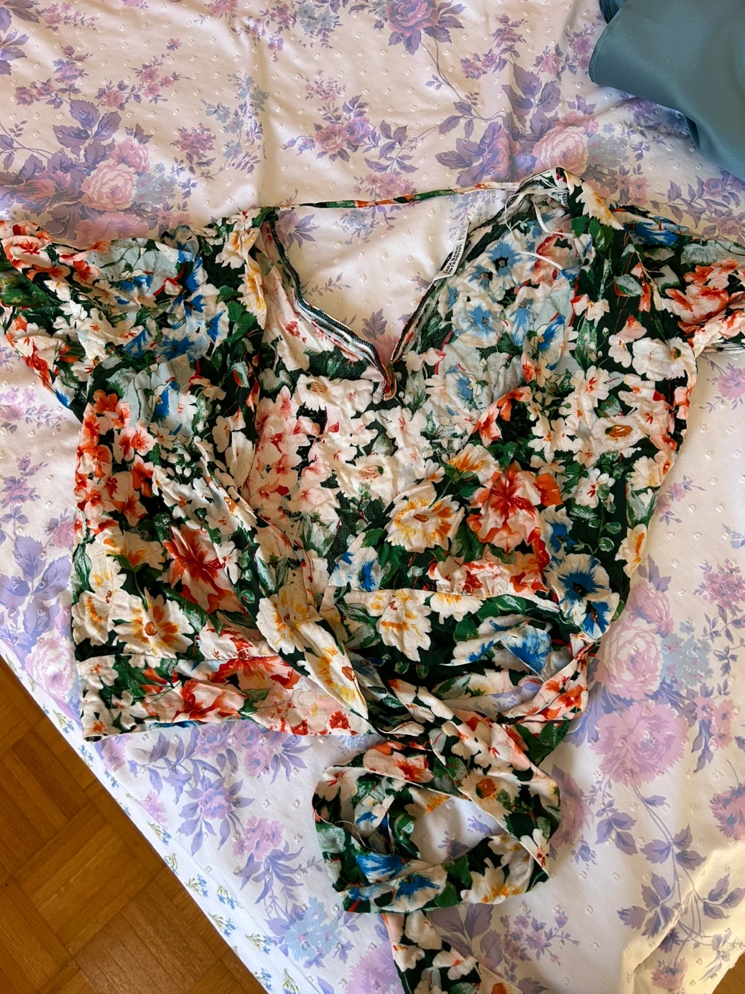 412Here's a cute floral print top with a tie front detail! It's perfect for adding a pop of colour to your wardrobe. The material feels light and breezy, great for warmer weather. From Zara, and tag says size 5.