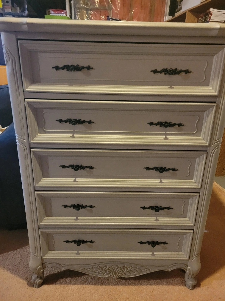 Bedroom set including a dresser with mirror, two nightstands, a tall dresser, and a headboard. Most pieces are painted in a light grey colour with black hardware. Perfect for a bedroom makeover!