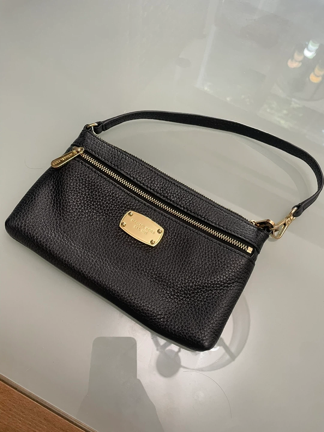 Selling a gently used Michael Kors wristlet. It's in great condition and perfect for carrying your essentials. The wristlet is made of black leather and features a gold-tone logo plate. It has a zippered closure and interior pockets