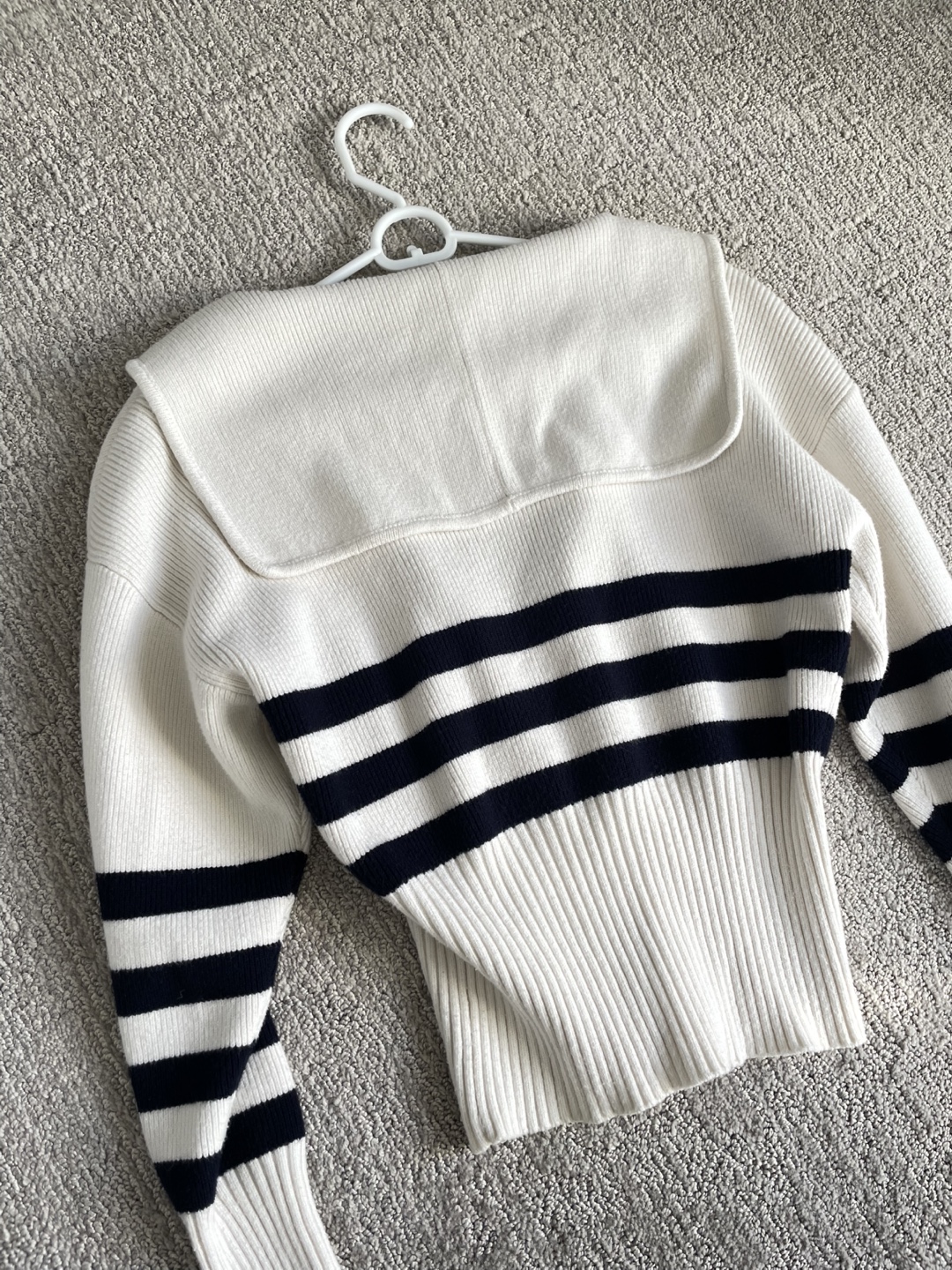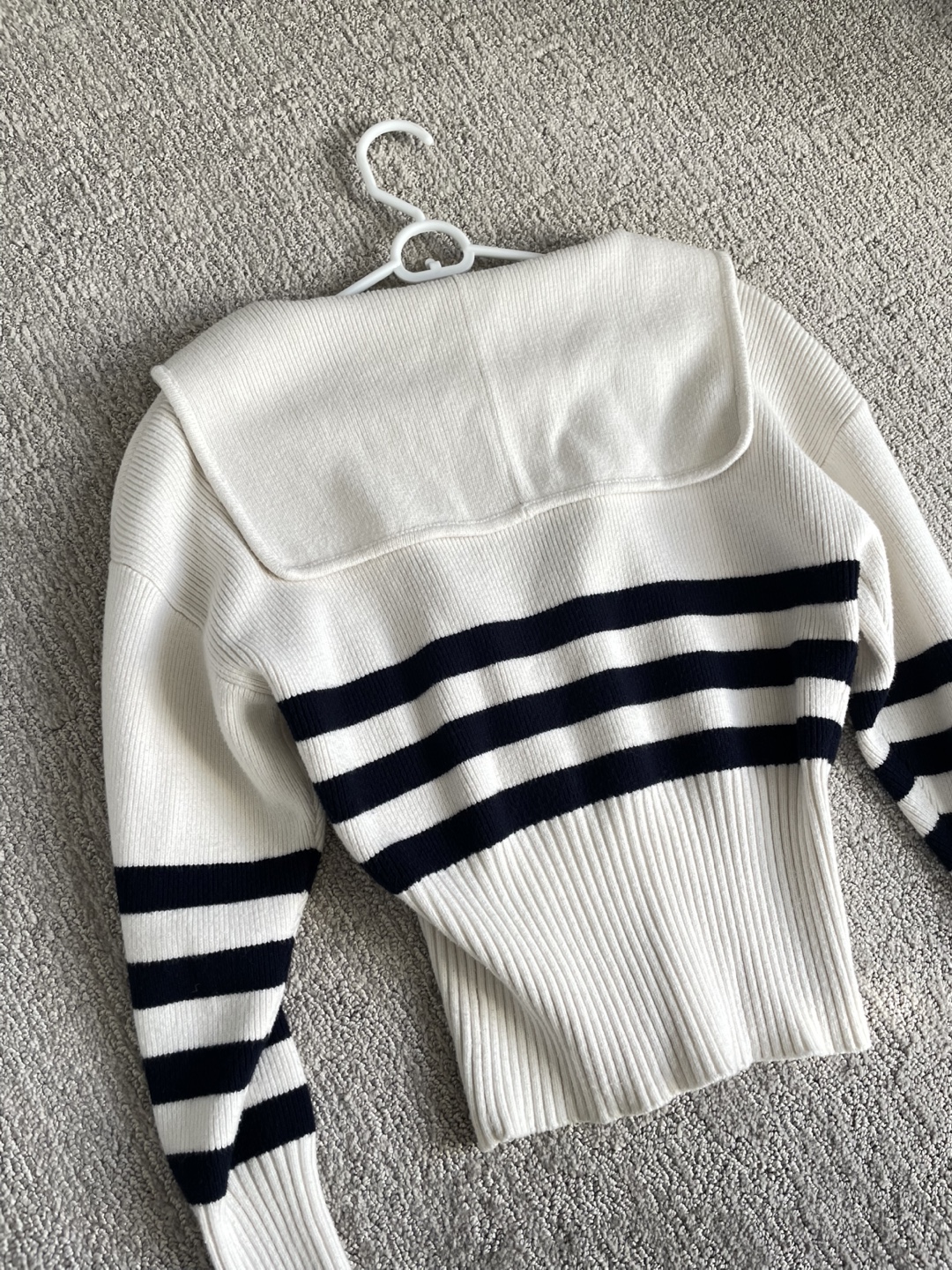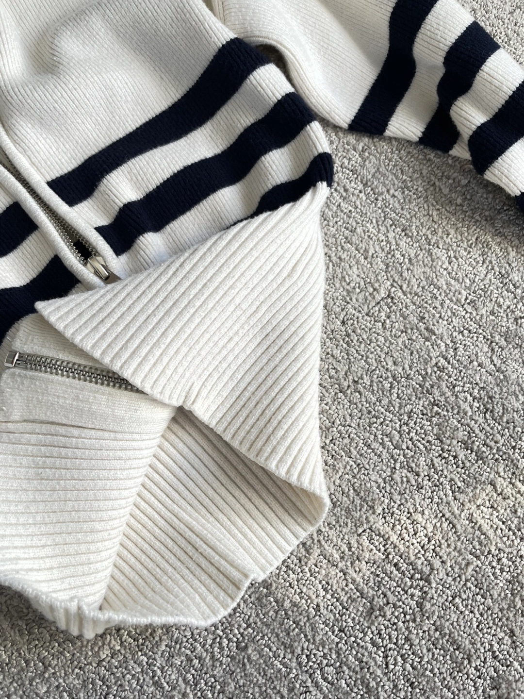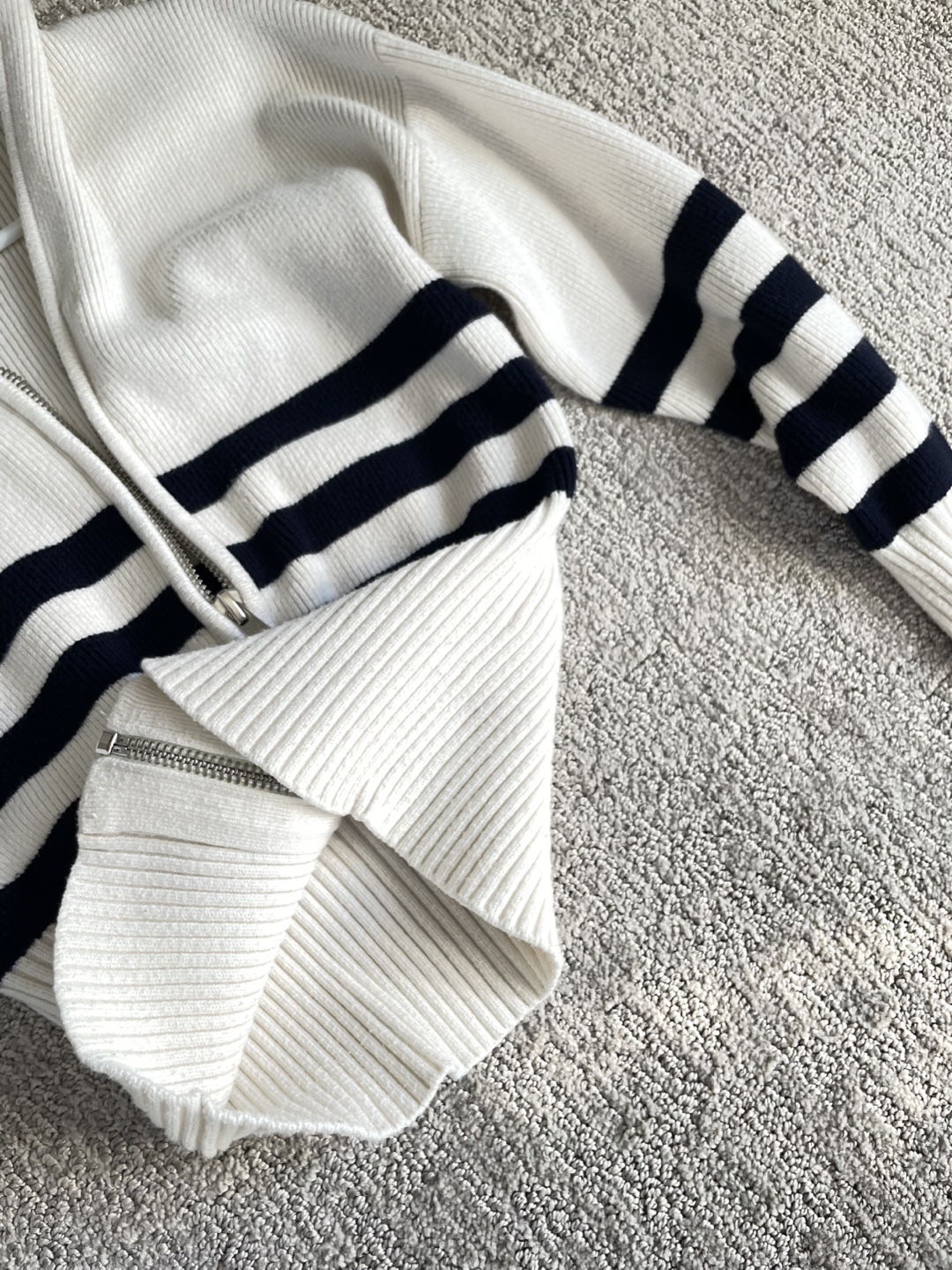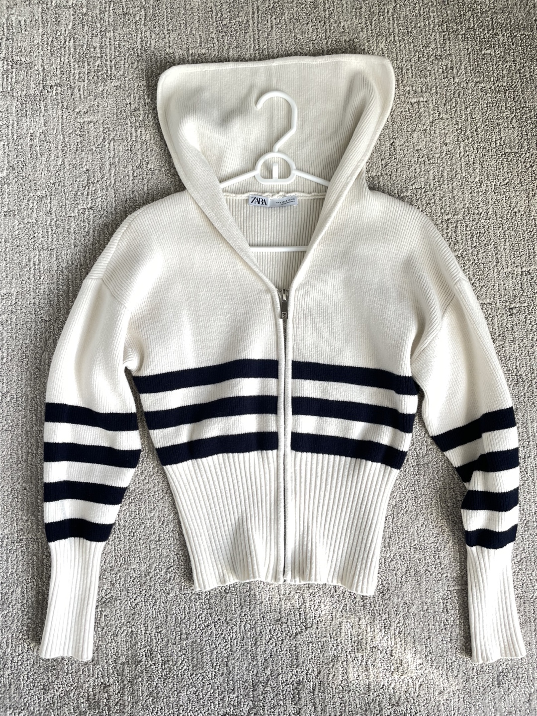 Cozy Zara knit hoodie with a nautical-inspired striped design! This zip-up is perfect for layering or wearing on its own. It's a size small and features a hood and a full zipper. The material is soft and comfortable, making it a great addition to your wardrobe!