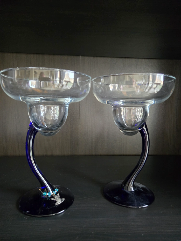 65Selling a set of two margarita glasses. They feature a clear glass bowl and a distinctive dark blue stem and base. Perfect for your next fiesta!