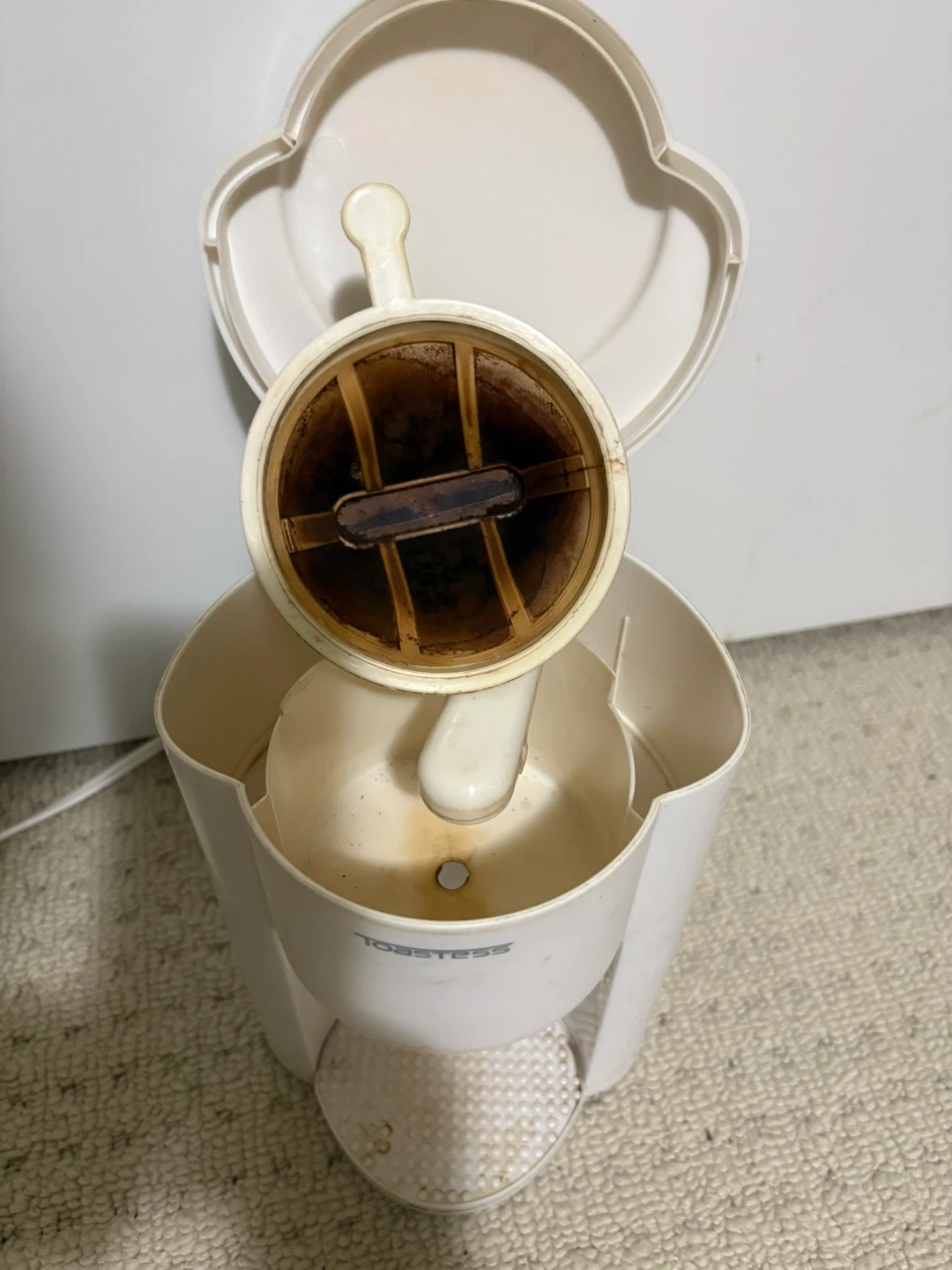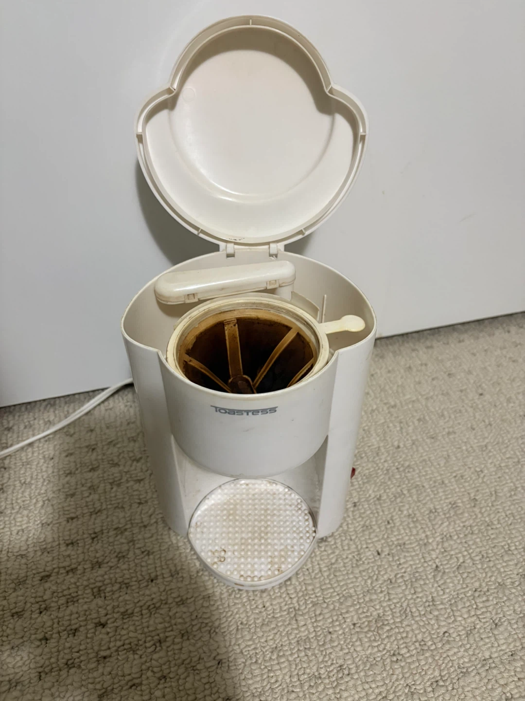 Selling a used Toastees single serving coffee maker. It’s coffee filter paperless.It has some signs of use, and minor holes in filter, as you can see in the photos, but it still works, still paperless. Perfect for a small kitchen or for single-serve coffee.