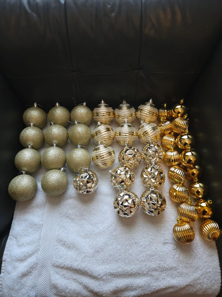 Selling 45 gold Christmas ornaments! There are different shades and textures, perfect for adding some sparkle to your tree this holiday season.