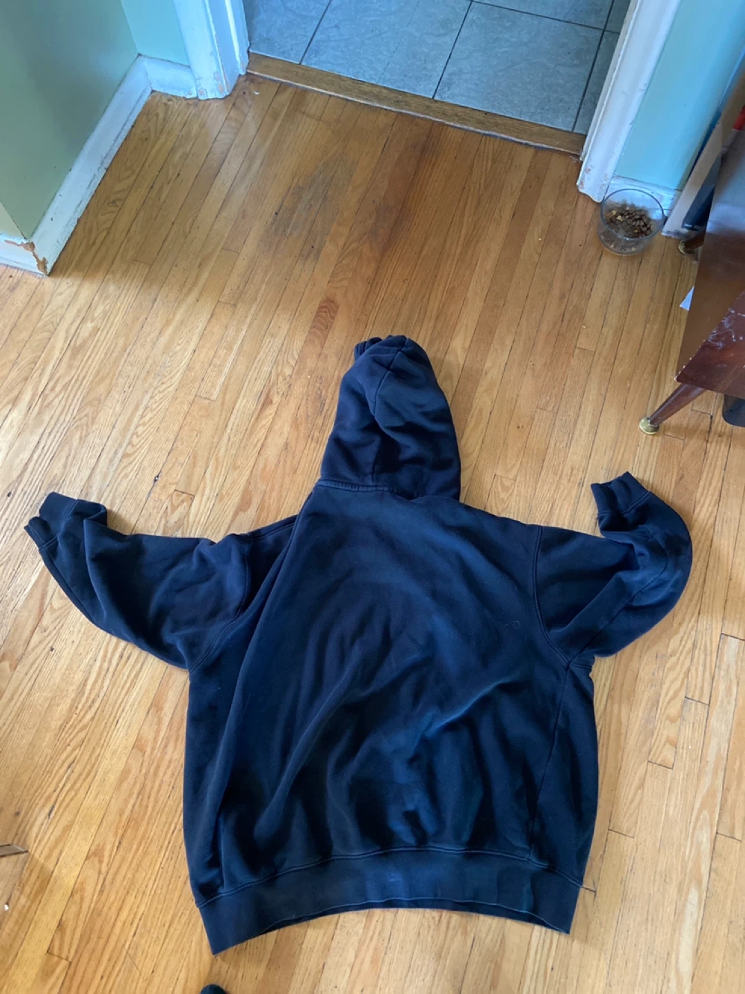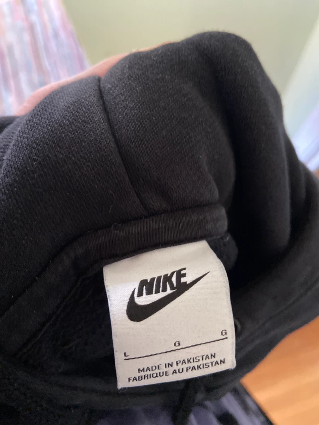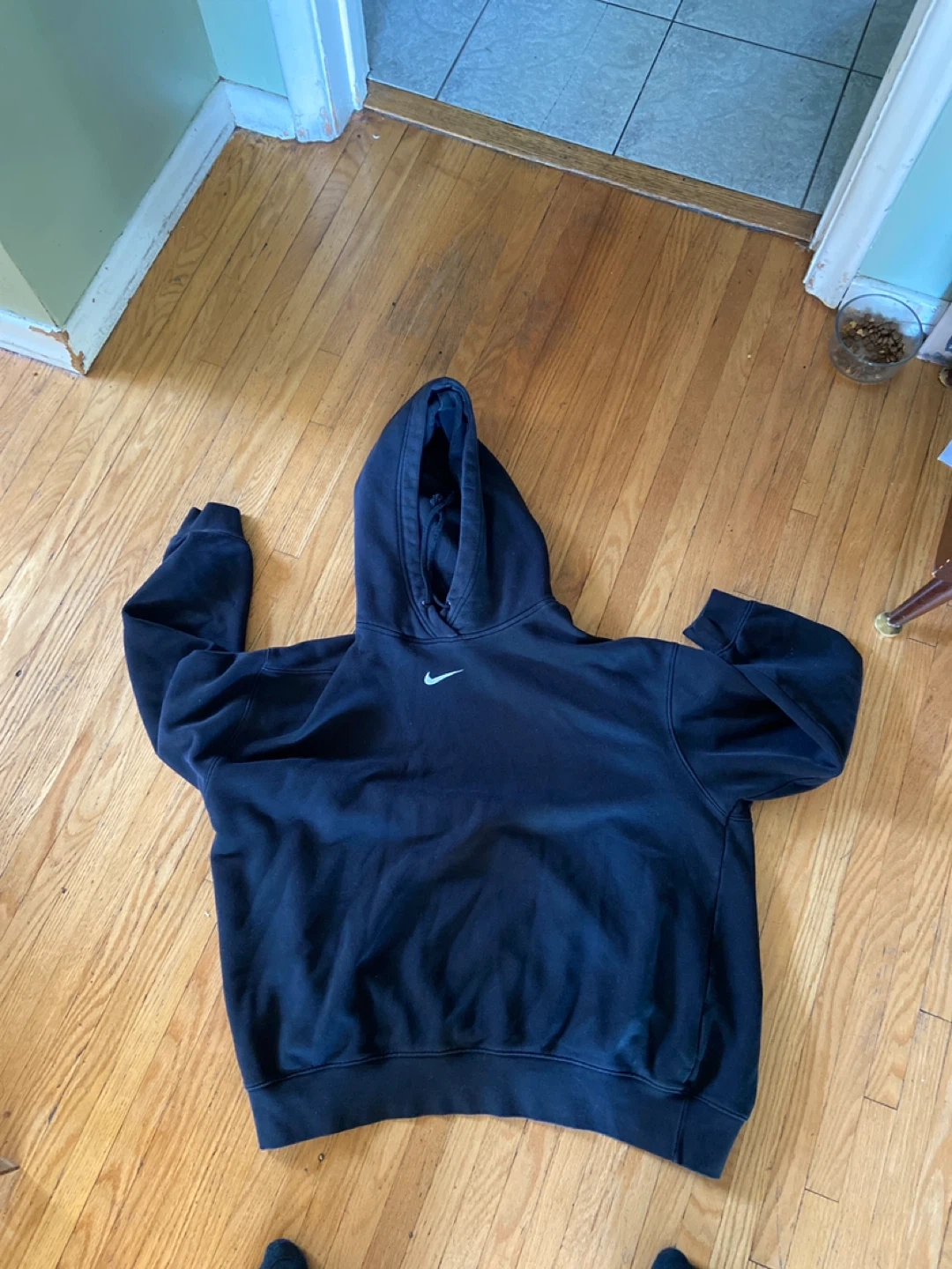 Selling a comfy Nike hoodie in black, size large. It's in great shape and ready for a new home. Perfect for layering or just lounging around! The classic Nike swoosh gives it a clean look.