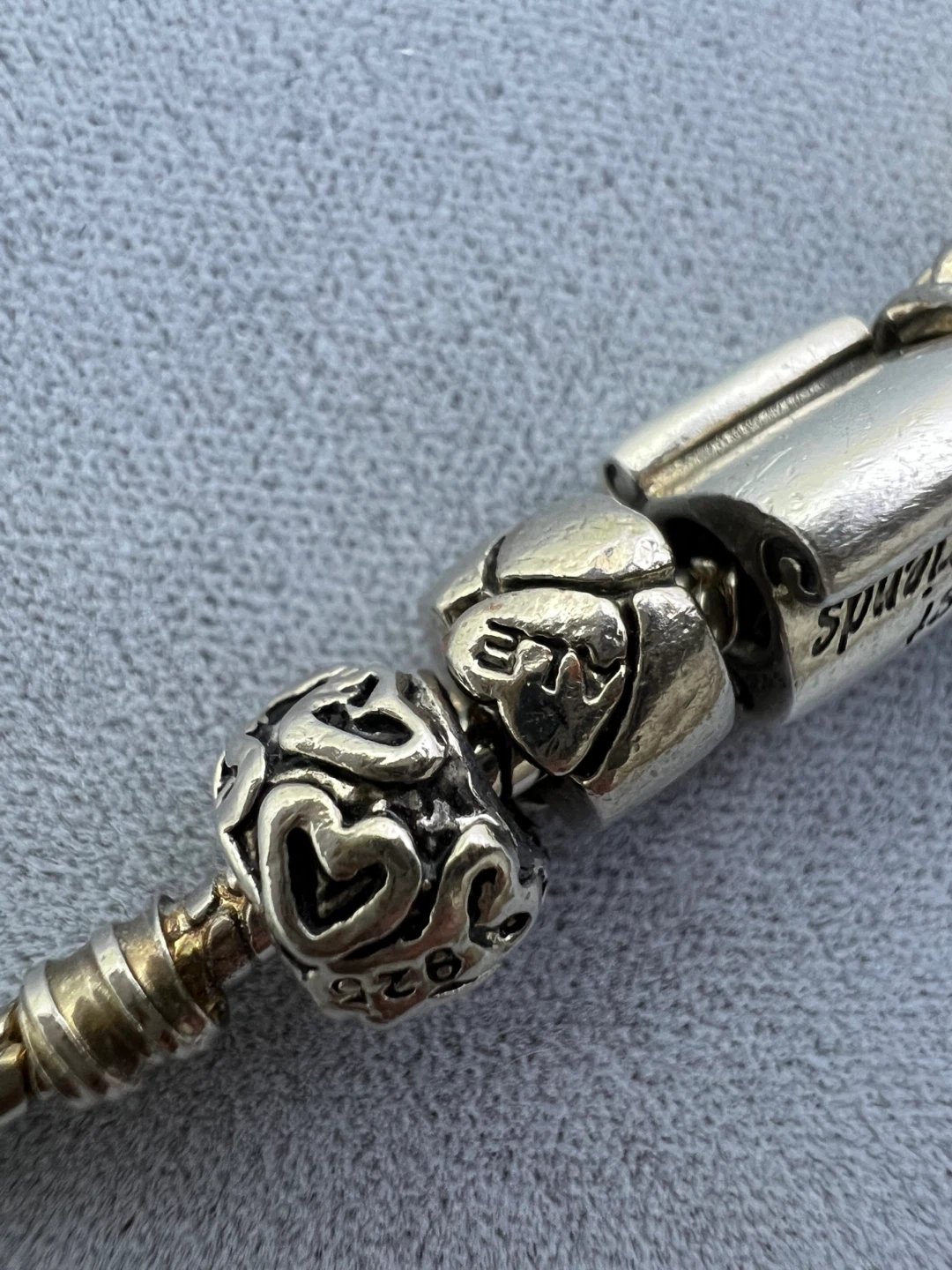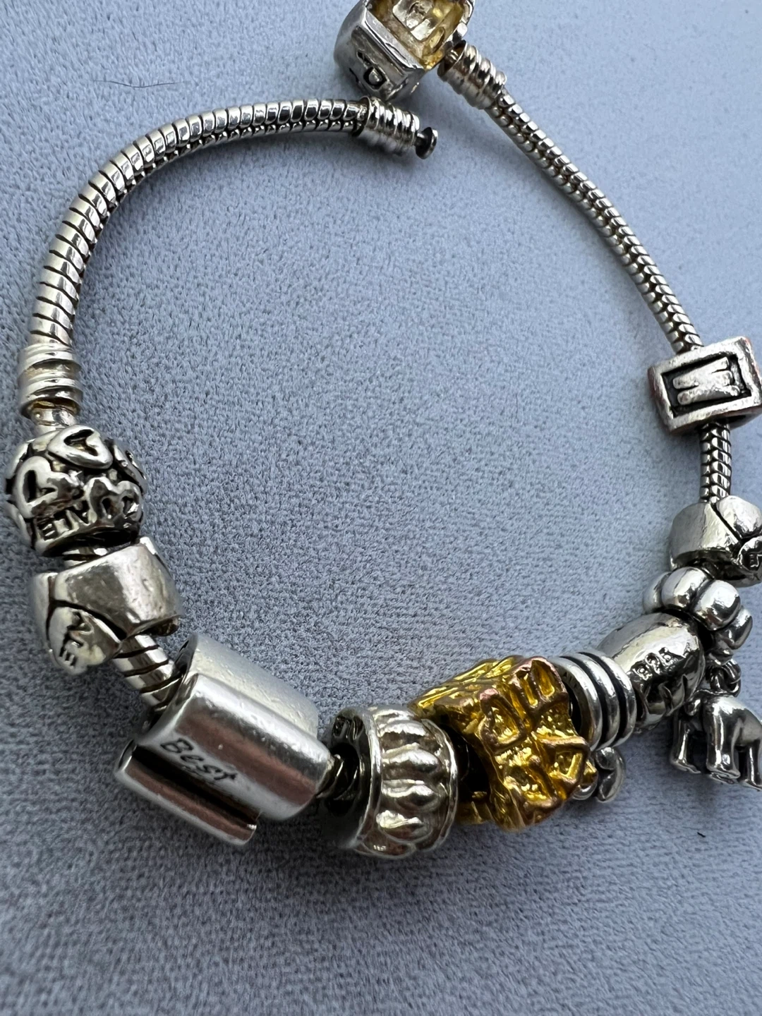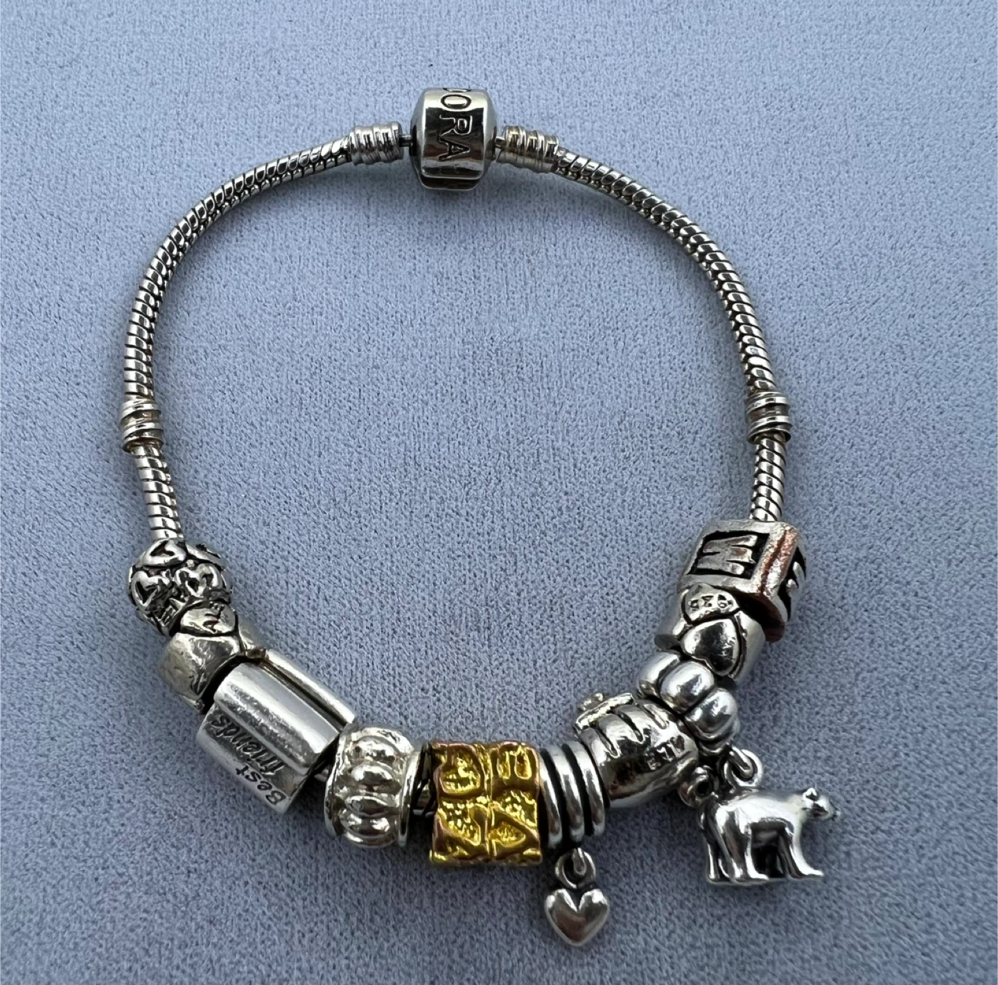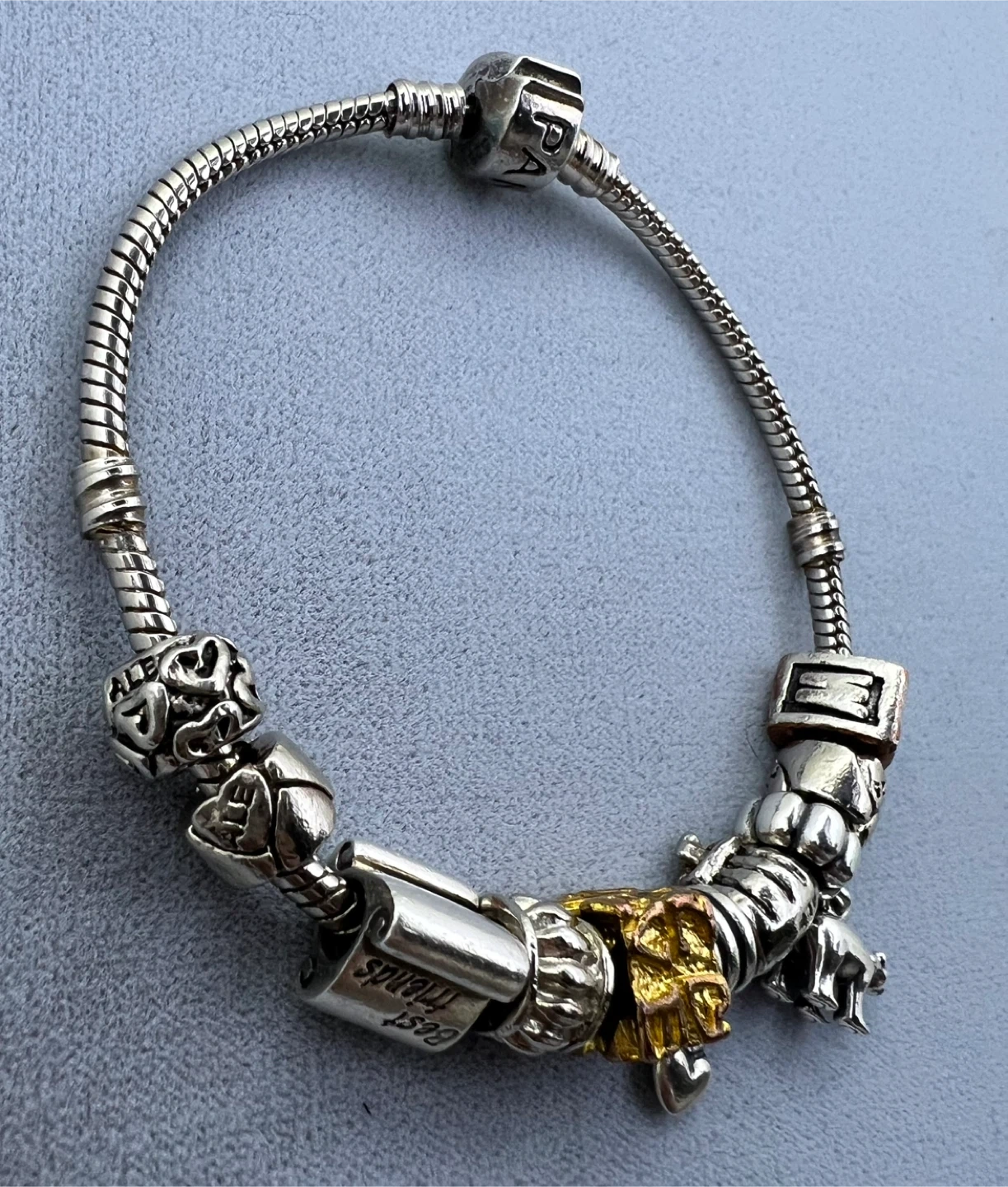 579Variety of beads/charms (10 in total) Plenty of room to add more… Standard Pandora clasp Almost 8” long Preloved Great condition —NOTE— YES - authentic Pandora YES - all the charms are marked 925 ALE (Pandora hallmark for sterling silver) NO - I am not selling charms separately Asking $75 Interested? Message me and please check my other listings…