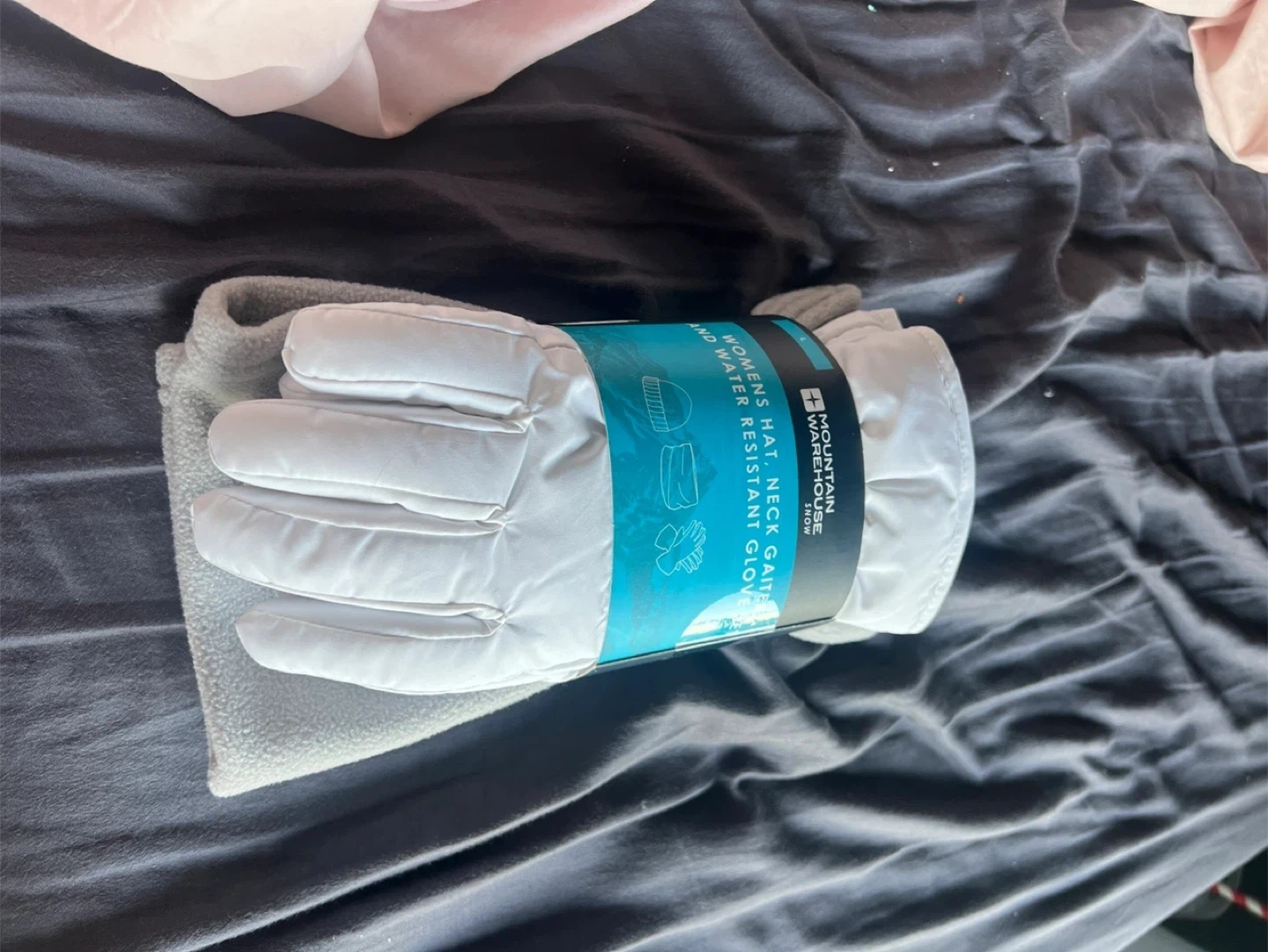 Selling a pair of Mountain Warehouse women's hat, neck gaiter and water resistant gloves. They are white and look to be in great condition!