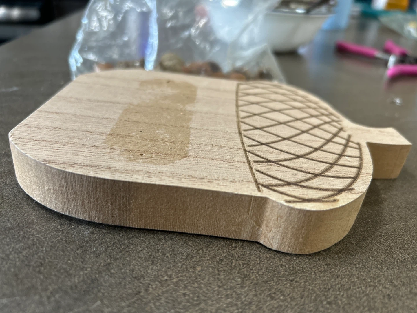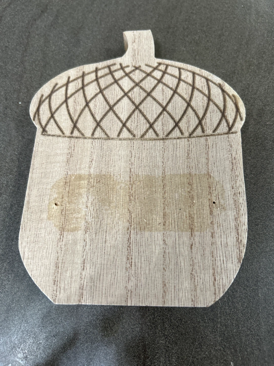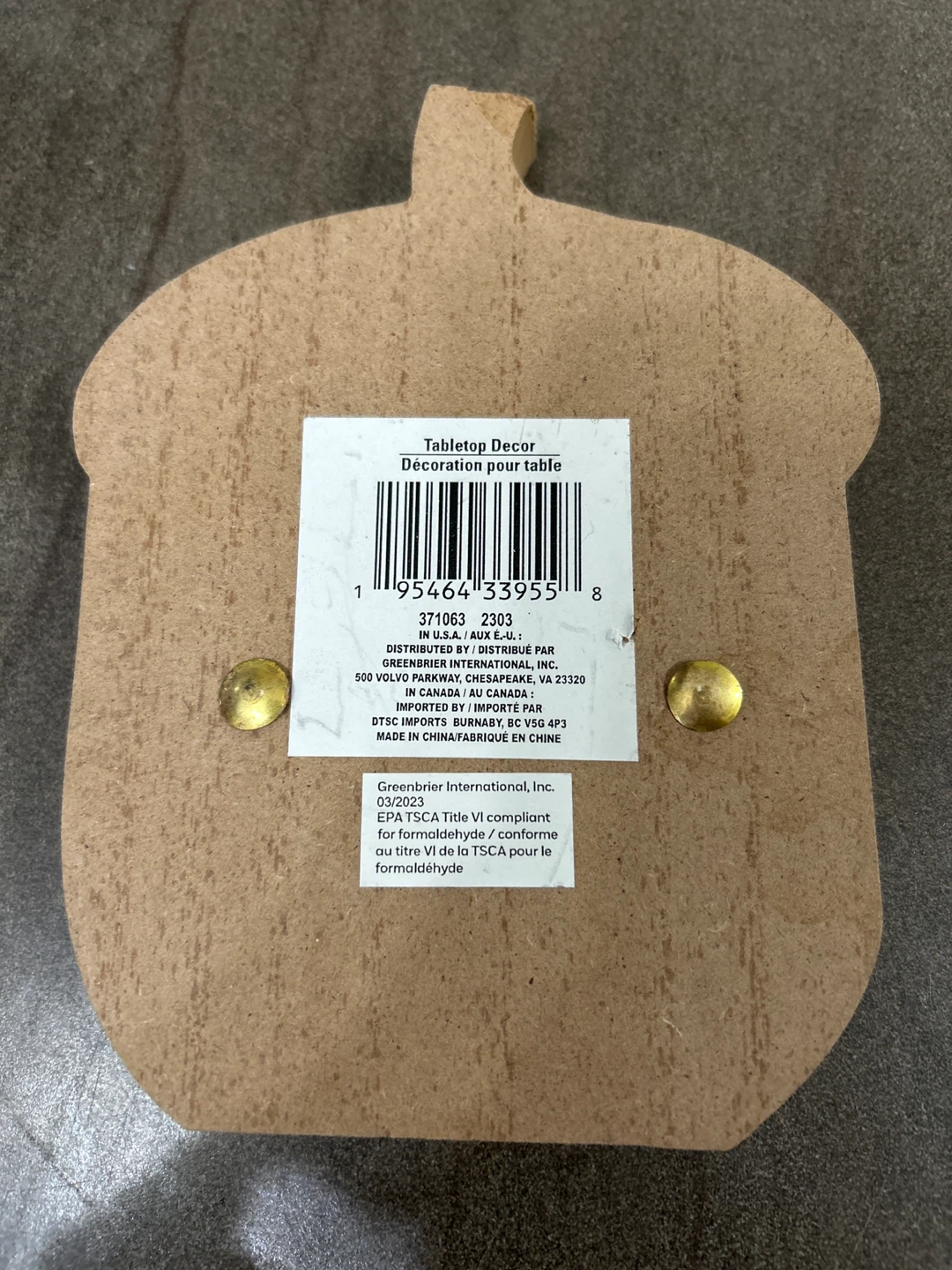 The acorn came with a decal but I took it off and wrapped a ribbon around it so the tacks are still there if you want to go that route. It’s thick but made out of particle board so it can be broken/ chipped. (See back - top)