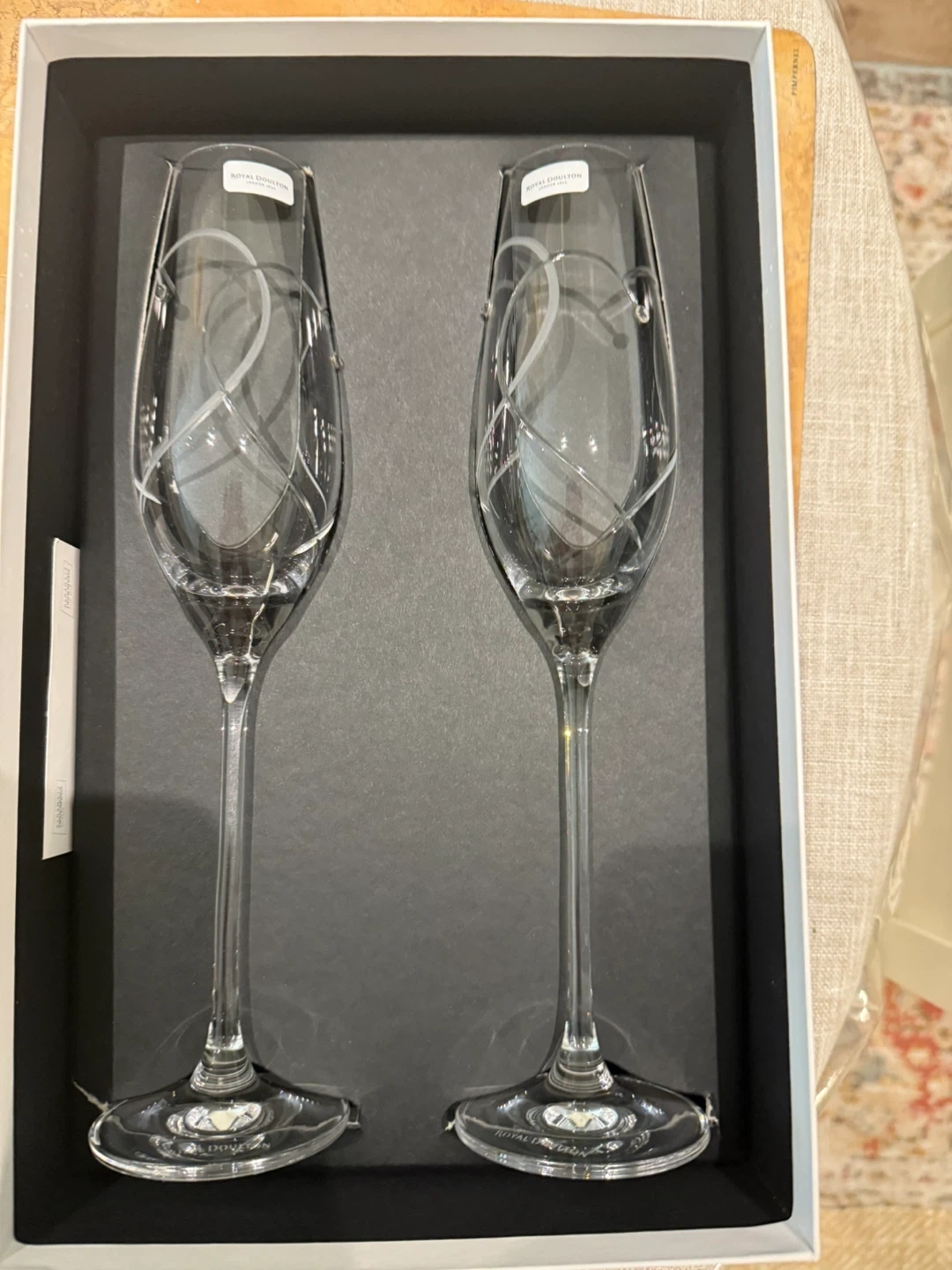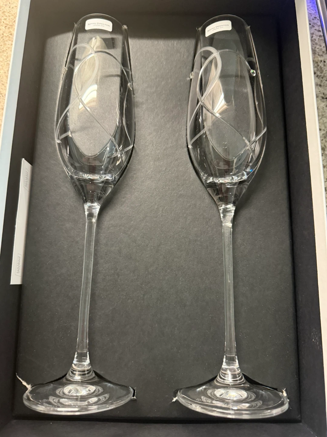 Selling a beautiful set of two Royal Doulton Infinity champagne flutes! These elegant glasses are perfect for celebrations or adding a touch of sophistication to any occasion. They come in their original box, making them ideal for gifting too. Never used still have the tags on them !!